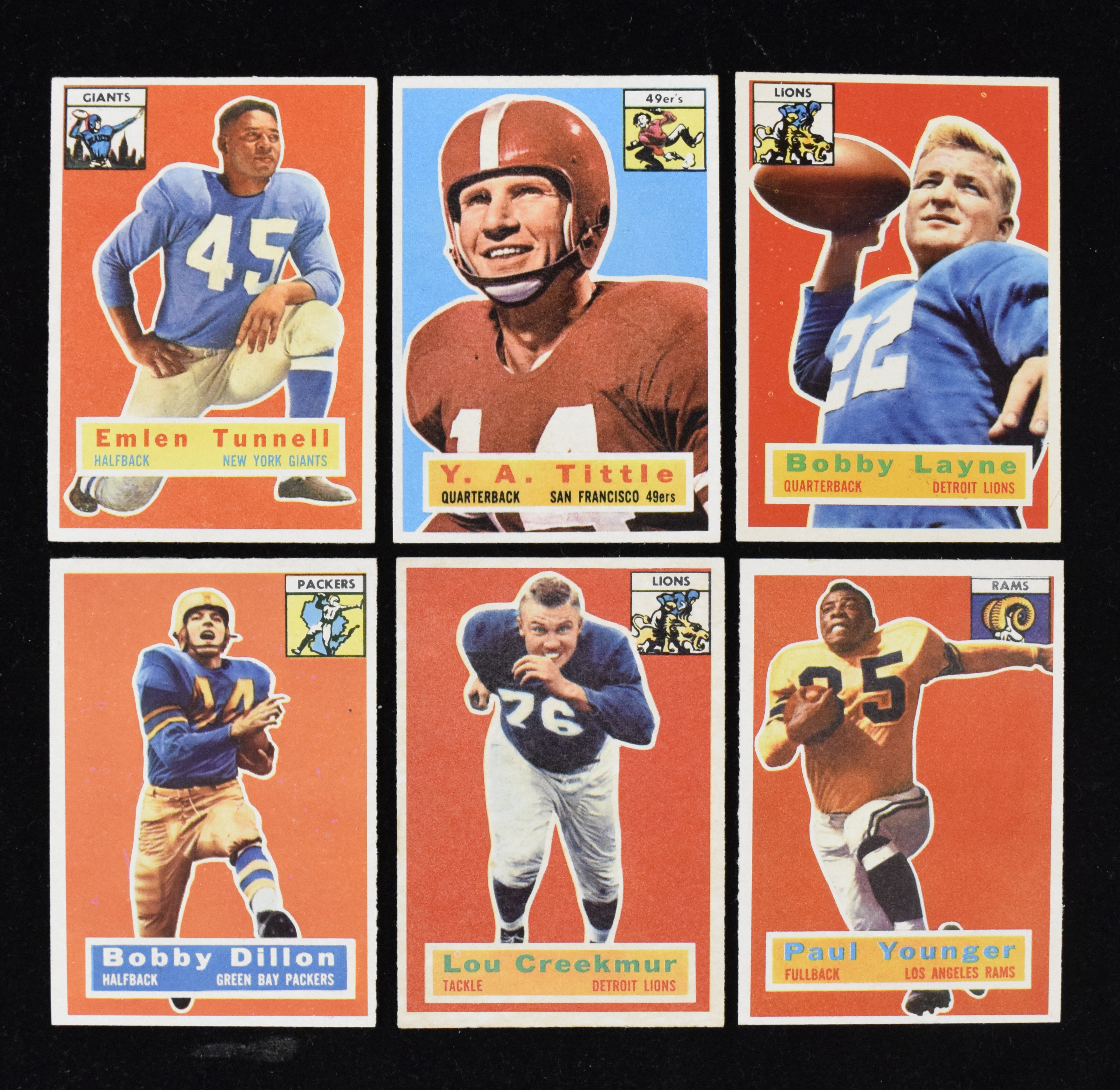 Description:Clean lot of (17) 1956 Topps FB cards with HOFers, including Tittle, Layne (VG/EX-EX/MT). Assortment of 1956 Topps football cards includes #s 17 Emlen Tunnell, 62, 10, 8 Lou Creekmur, 39, 3, 27, 18, 103, 80, 73, 85, 86 Y.A. Tittle, 116 Bobby Layne, 110, 20 Jack Christiansen and 96. Most appear EX-EX/MT. Range: VG/EX-EX/MT.