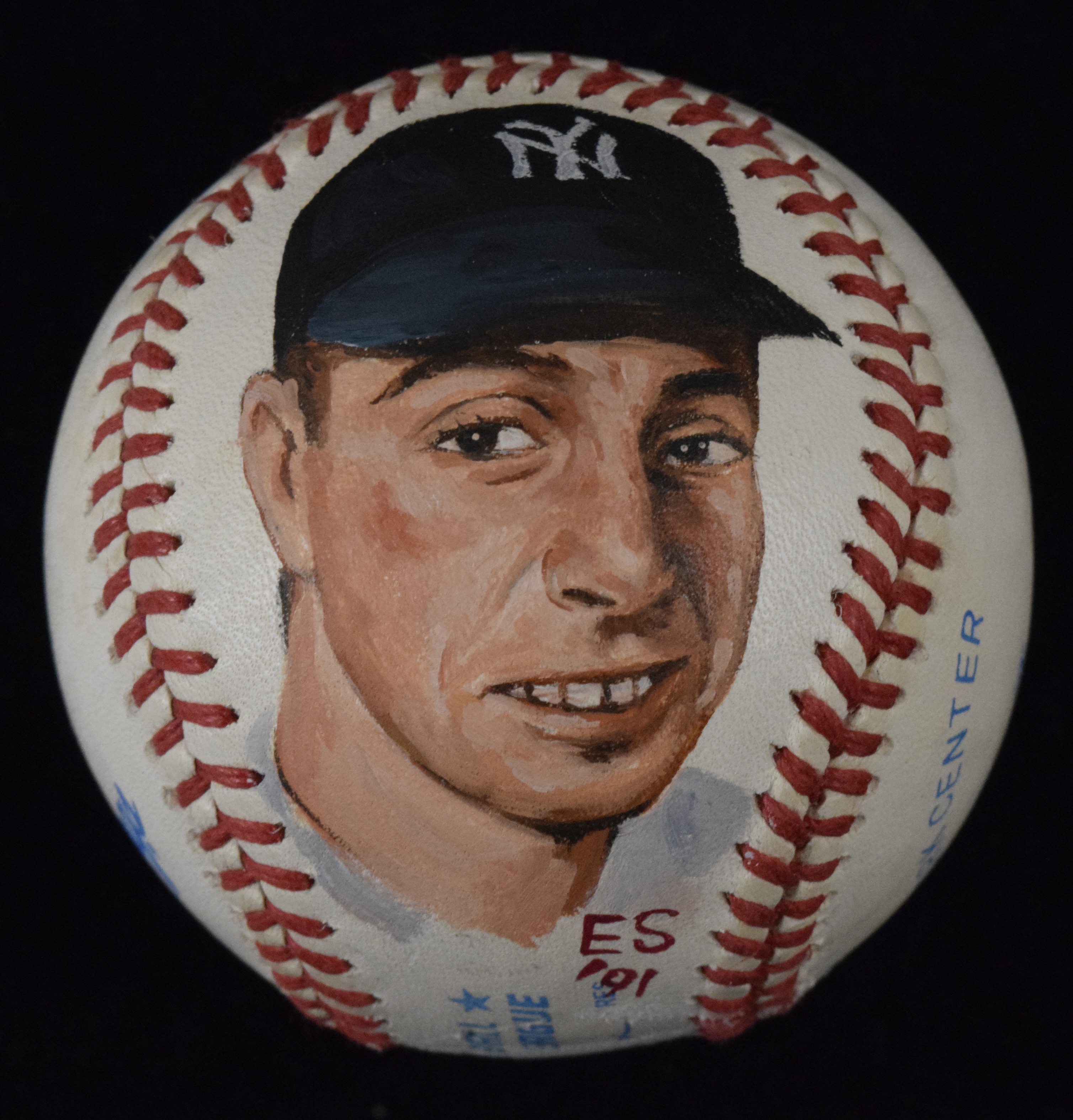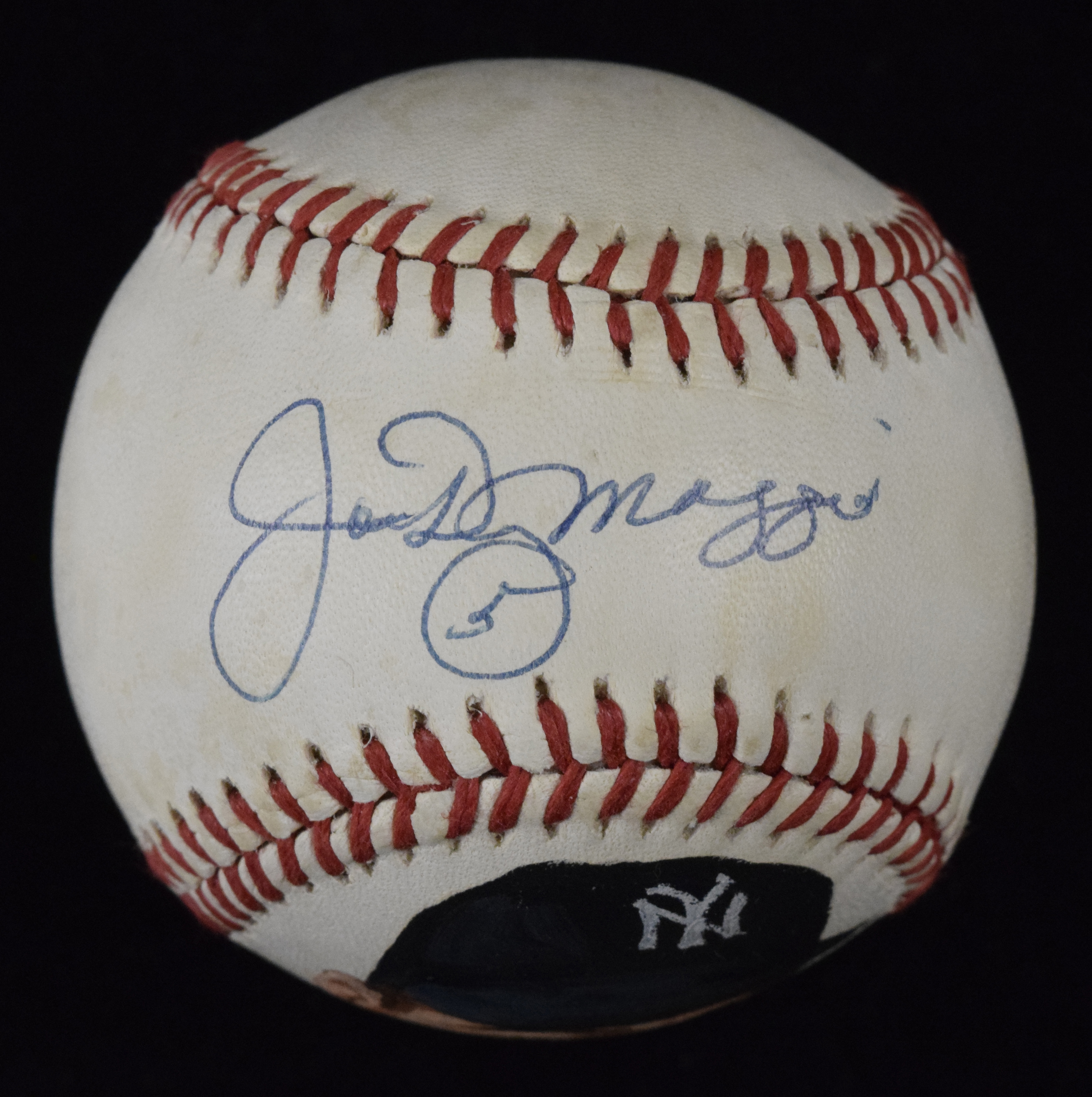 Description:Joe DiMaggio autographed and hand-painted B. Brown baseball (Sig. MT). B. Brown A.L. baseball includes a nicely executed hand-painted portrait of Joe DiMaggio on one panel, initialed by the artist "ES '91." DiMaggio signed on the sweet spot in blue ink with "5" inscription, rating 9 out of 10. Ball has some wear/toning, including some fading to the stamping: VG/EX.