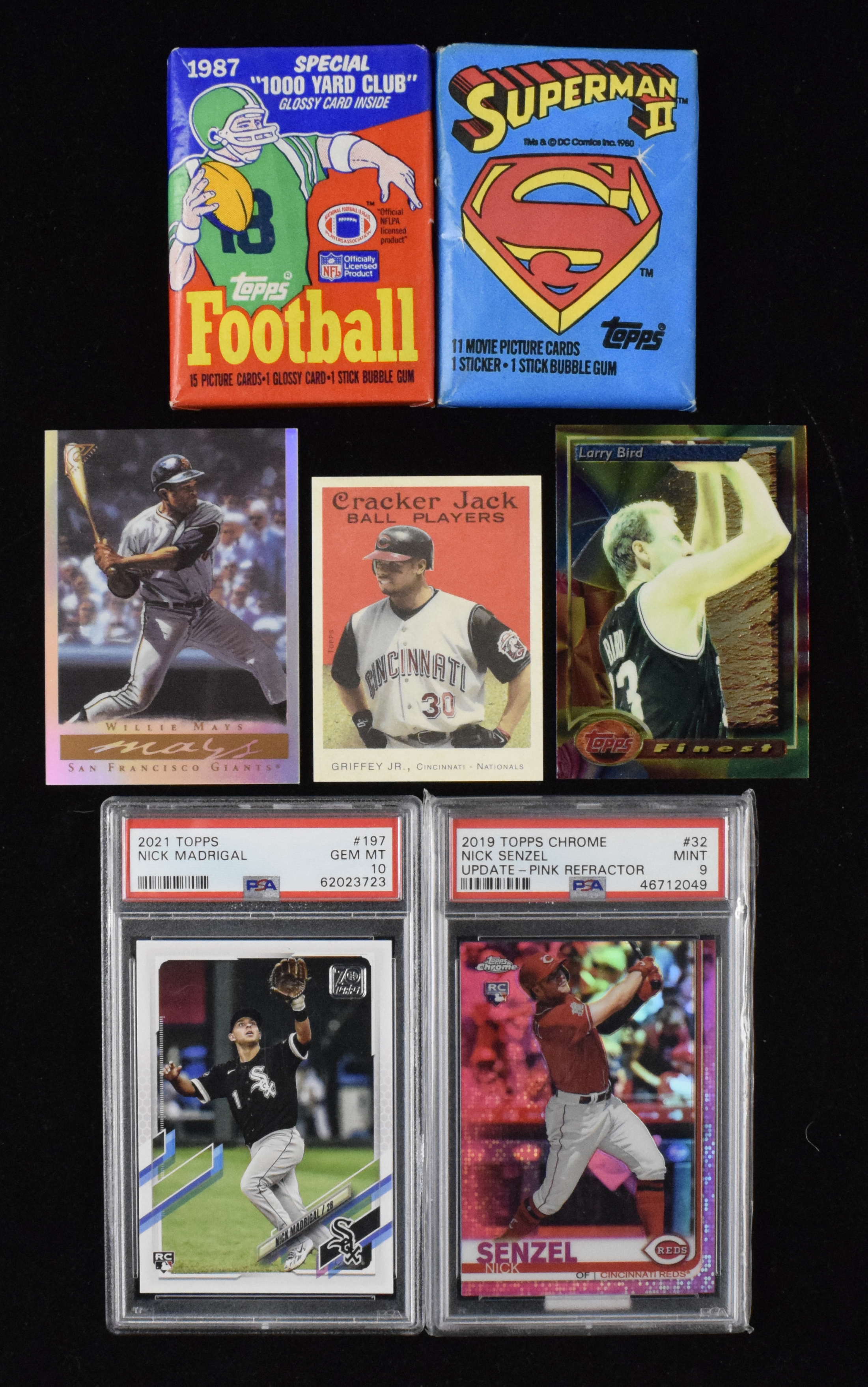 Description:1980s-2000s multi-sport and nonsports lot of (6,000+) cards with PSA graded, packs (NM-NM/MT+). Multi-sport and nonsport breakdown value lot is highlighted (600+) 2004 Topps Cracker Jack cards, including complete base set, complete Mini set, SPs and extras; (200+) 2003 Topps Gallery HOF with variations and Chrome cards (possible master set); (1,300+) 1980s-1990s baseball stars and rookies; (7) 1980 Topps Superman 2 unopened wax packs; (9) 1987-1990 baseball and football unopened wax packs; (1) 1989 Bowman factory-sealed set; (1) 1980-81 Topps basketball wax pack wrapper (no cards); (300+) 1994 Topps Finest football and basketball cards, (6) modern PSA-graded cards, numerous small retail box sets and many other misc. cards waiting to be found. Most appear NM-NM/MT or better with some lesser here and there.
