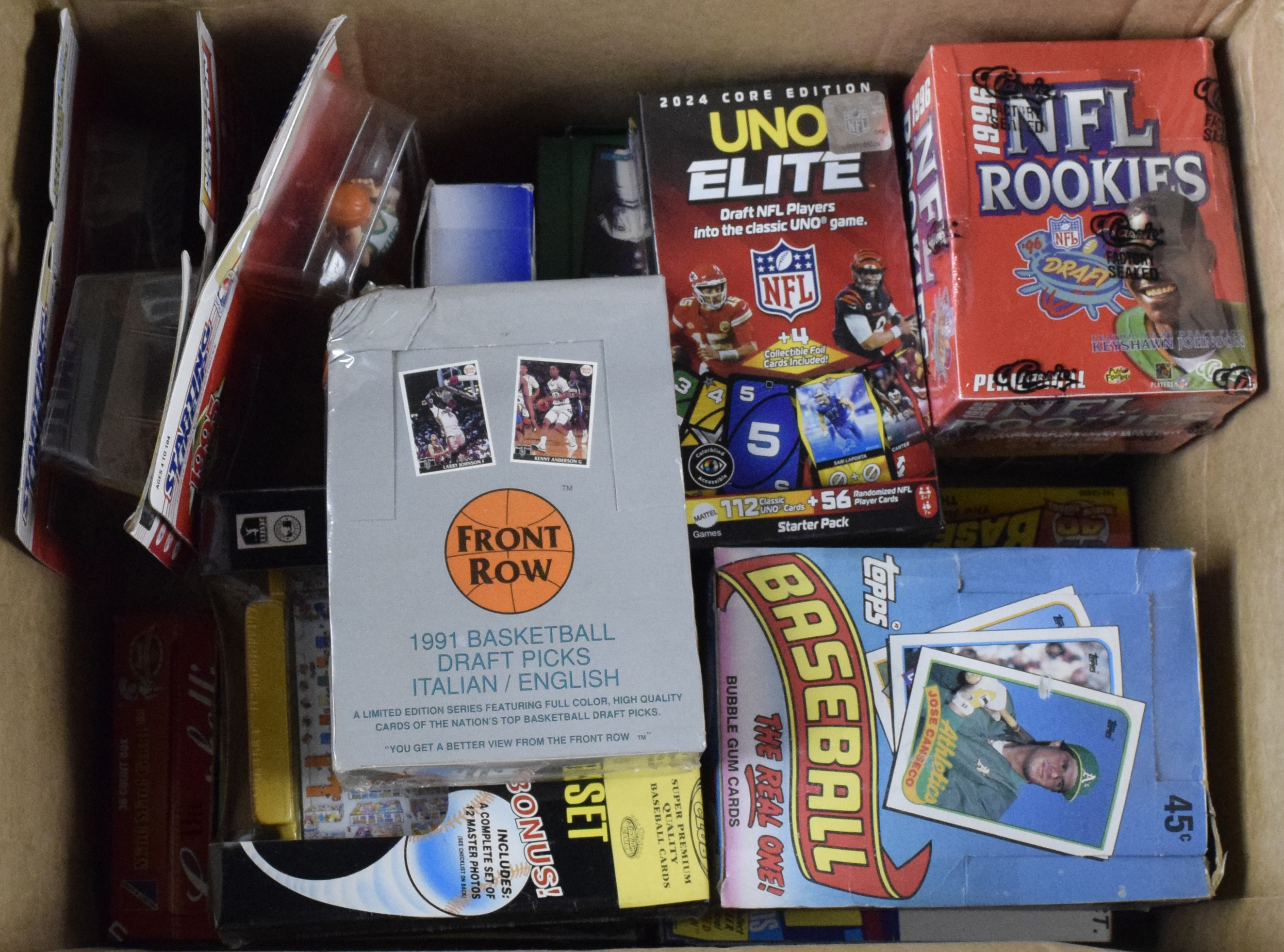 Multi-sport lot of hobby and wax boxes, complete sets and more (VG-MT). Lot includes (1) 1991 Topps Micro open factory set; (1) 1991 Score open factory set; (1) 1996 Classic NFL Rookies factory-sealed hobby box; (1) 1991 Front Row Basketball Draft Picks factory sealed hobby box; (1) 1996 Fleer NFL FACT hobby box (10) unopened packs; (1) 1993 Toys R Us factory-sealed baseball set; (1) 1989 Topps wax box; (1) 1988 Fleer wax box; (1) 1990 Topps Coins hobby box; (1) 2024 Mattel Uno Elite factory-sealed Starter Pack; (1) 1995 Campbells Collection open hobby box and (3) on-card 1993-1995 Starting Lineups, including Hakeem Olajuwon. Some boxes have moderate to heavy wear. Range: VG-MT.
