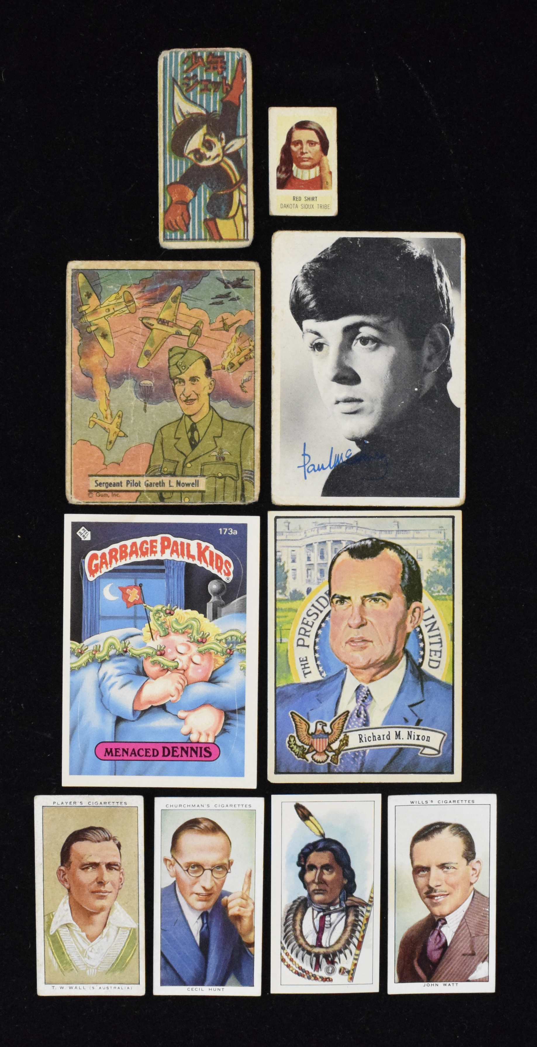 Description:Lot of (200+) 1900s-1980s nonsports cards with complete sets (PR-NM). Highlights include (28) 1952 Bowman U.S. Presidents; (7) 1964 Topps Beatles cards; (3) 1942 Gum Inc. War cards; (4) 1949 Topps X-Ray Roundup cards; (1) 1962 G.P. Tea American Indian Tribes complete set (25); (1) 1934 John Player & Sons Cricketers complete set (50); (30+) Japanese Menko cards; (1) 1934-35 W.D. & H.O Wills Radio Celebrities complete set (50); (1) 1928 Churchman's In Town Tonight complete set (50) (35+) 1980s Garbage Pail Kids (no Series 1 or 2); and many more. Most appear VG-VG/EX with some better and some worse. Range: PR-NM.