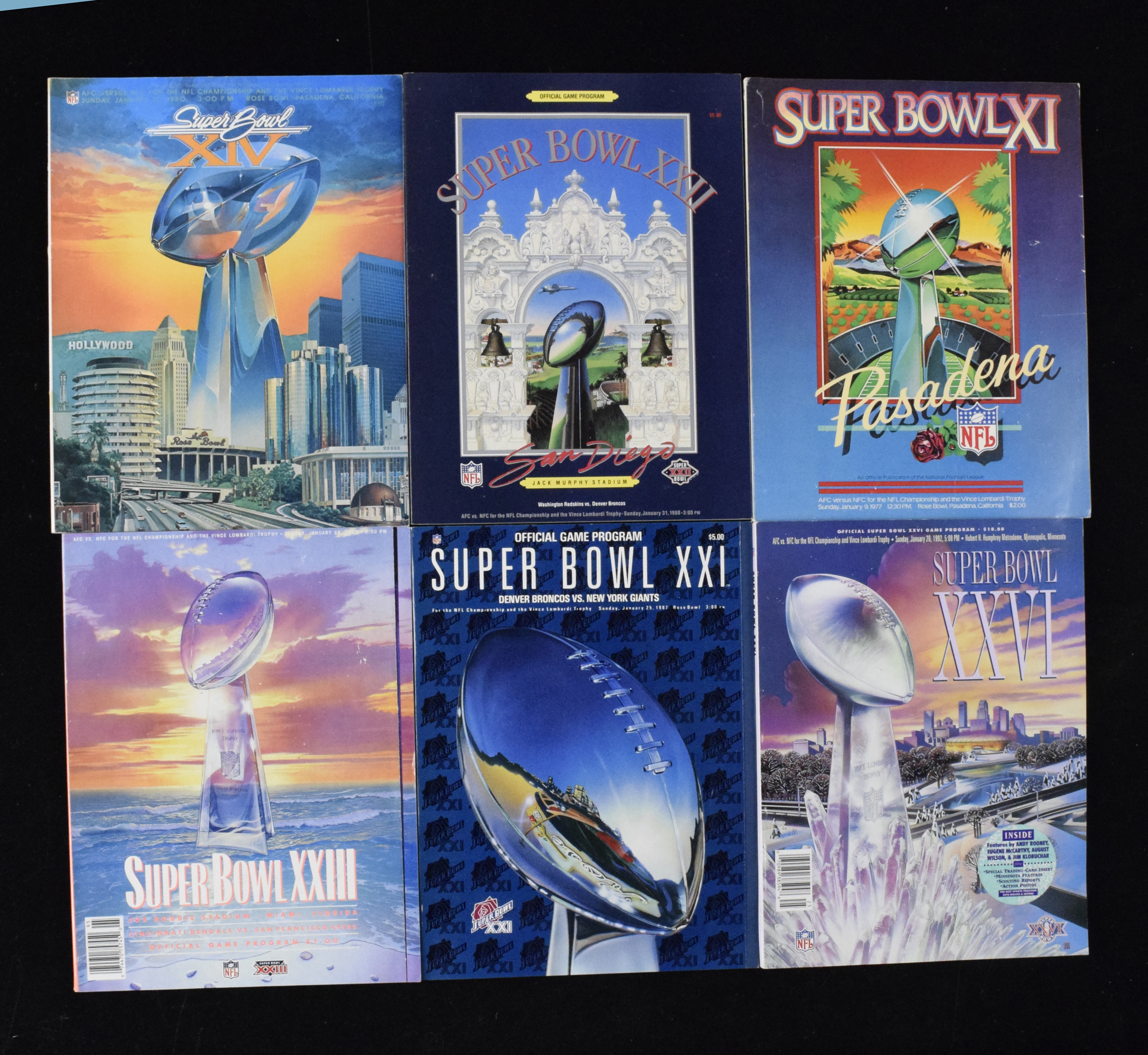 Description:Lot of (22) 1980s-1990s Super Bowl programs (EX-NM/MT). Lot of programs includes (16) Super Bowl XXII; (2) Super Bowl XXVI; (1) Super Bowl XIV; (1) Super Bowl XI; (1) Super Bowl XXI and (1) Super Bowl XXIII. Range: EX-NM/MT.