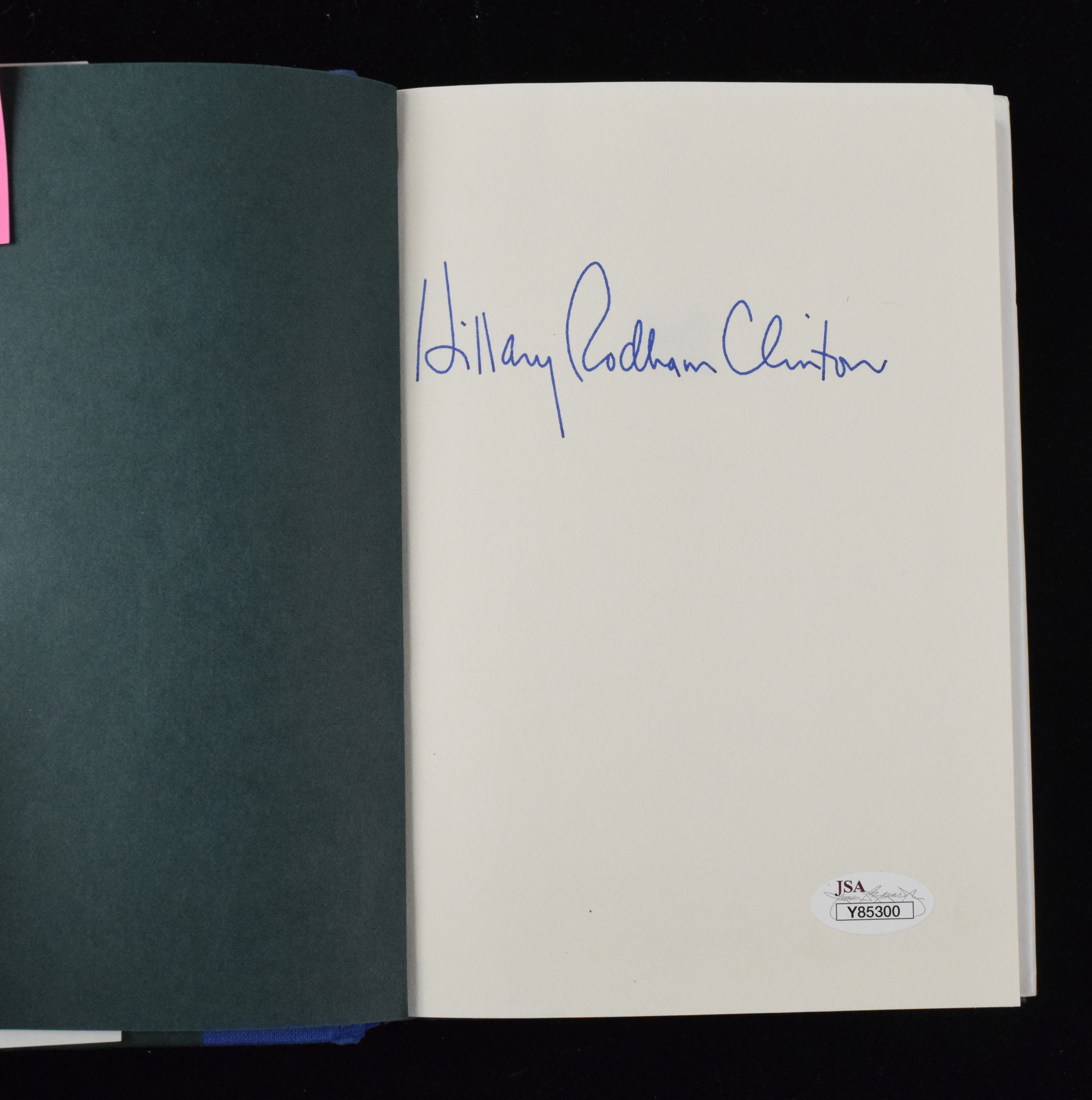 Description:Hillary Rodham Clinton autographed hardcover book with full JSA LOA (Sig. MT). Hardcover "It Takes a Village and Other Lessons Children Teach Us" has been signed on an interior page by Hillary Rodham Clinton, rating 9/10 out of 10. A JSA authentication sticker is affixed to the page, and a full JSA LOA is also included. Book has light wear: EX/MT.
