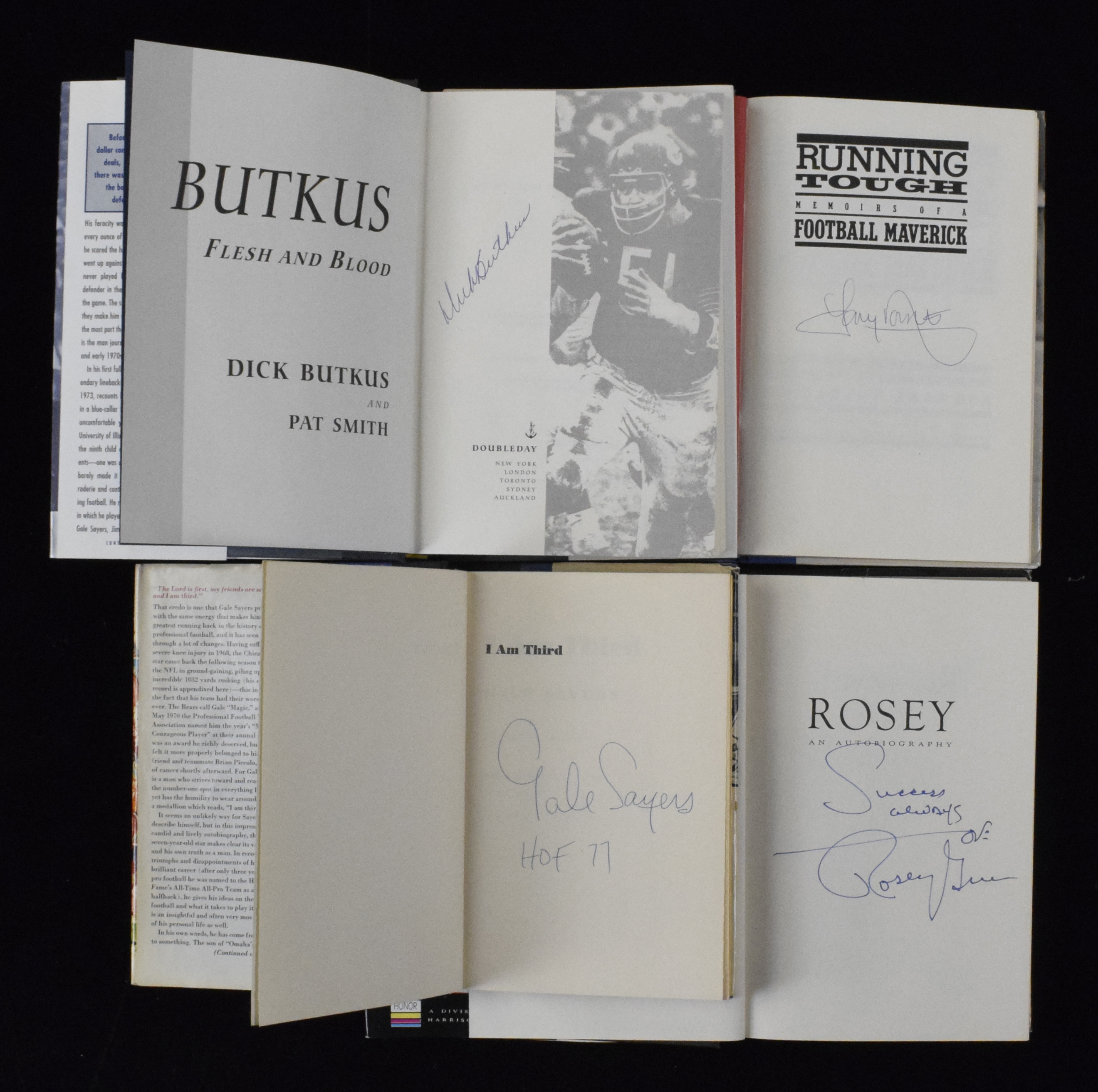 Description:Lot of (5) NFL player autographed hardcover books, with Dorsett, Butkus & Sayers (Sigs. NM/MT-MT). Nice assortment of hardcover books, with each autographed on the title or interior page. Includes (1) "I Pass," signed by Y.A. Tittle; (1) "I Am Third," signed by Gale Sayers with "HOF 77" inscription; (1) "Rosey," signed by Rosey Grier; (1) "Butkus Flesh and Blood," signed by Dick Butkus' and (1) "Running Tough," signed by Tony Dorsett. Signatures rate 8/9 out of 10, and books have light to moderate wear: EX-NM.