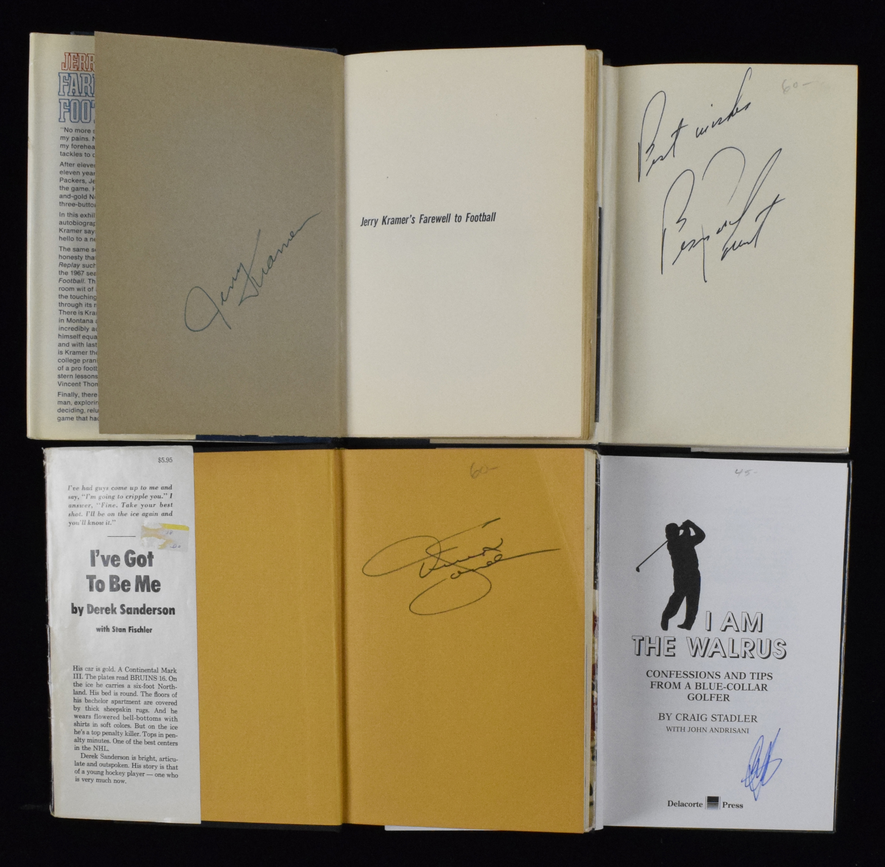 Description:Lot of (9) autographed sports books with many golf (Sigs. NM/MT-MT). Nice assortment of hardcover books, with each autographed on the title or interior page. Includes (1) "Farewell to Football" signed by Jerry Kramer; (1) "How to Win at Golf," signed by Fred Canausa; (1) "Secrets to Accurate Putting and Chipping," signed by Phil Galvano; (1) "The Impact Zone," signed by Bobby Clampett (personalized); (1) "I am The Walrus," signed by Craig Stadler; (1) "The 19th Hole," signed by Carol Mann (personalized); (1) "Bernie! Bernie! Bernie!," signed by Bernie Parent; (1) "Teed Off," signed by Dave Hill; and (1) "I've Got to Be Me," signed by Derek Sanderson. Signatures rate 8/9 out of 10, and books have light to moderate wear: EX-NM.