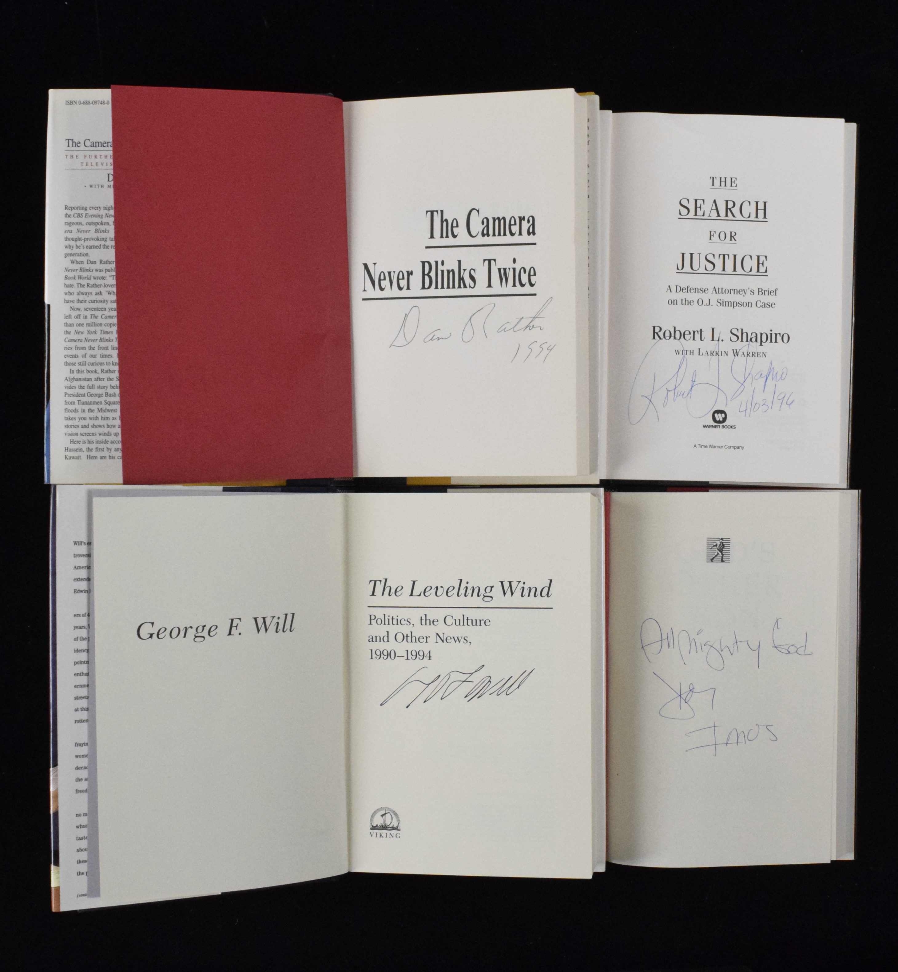 Description:Lot of (6) author & celebrity-signed hardcover books with Imus, Rather and Will (Sigs. NM/MT-MT). Nice assortment of hardcover books, with each autographed on the title or interior page. Includes (1) "A Search for Justice," signed by Robert Shapiro; (1) "The Leveling Wind," signed by George F. Will; (1) "The Coming Race War in America," signed by Carl T. Rowan; (1) "God's Other Son," signed by Don Imus with "All Mighty God," inscription; (1) "I Remember," signed by Dan Rather with "CBS News" inscription and (1) "The Camera Never Blinks Twice," signed by Dan Rather. Note: This lot has been screened for authenticity, but it is possible one or both the Dan Rather signatures (and possibly others in the lot) are secretarial. Signatures rate 8/9 out of 10, and books have light wear: EX/MT-NM.