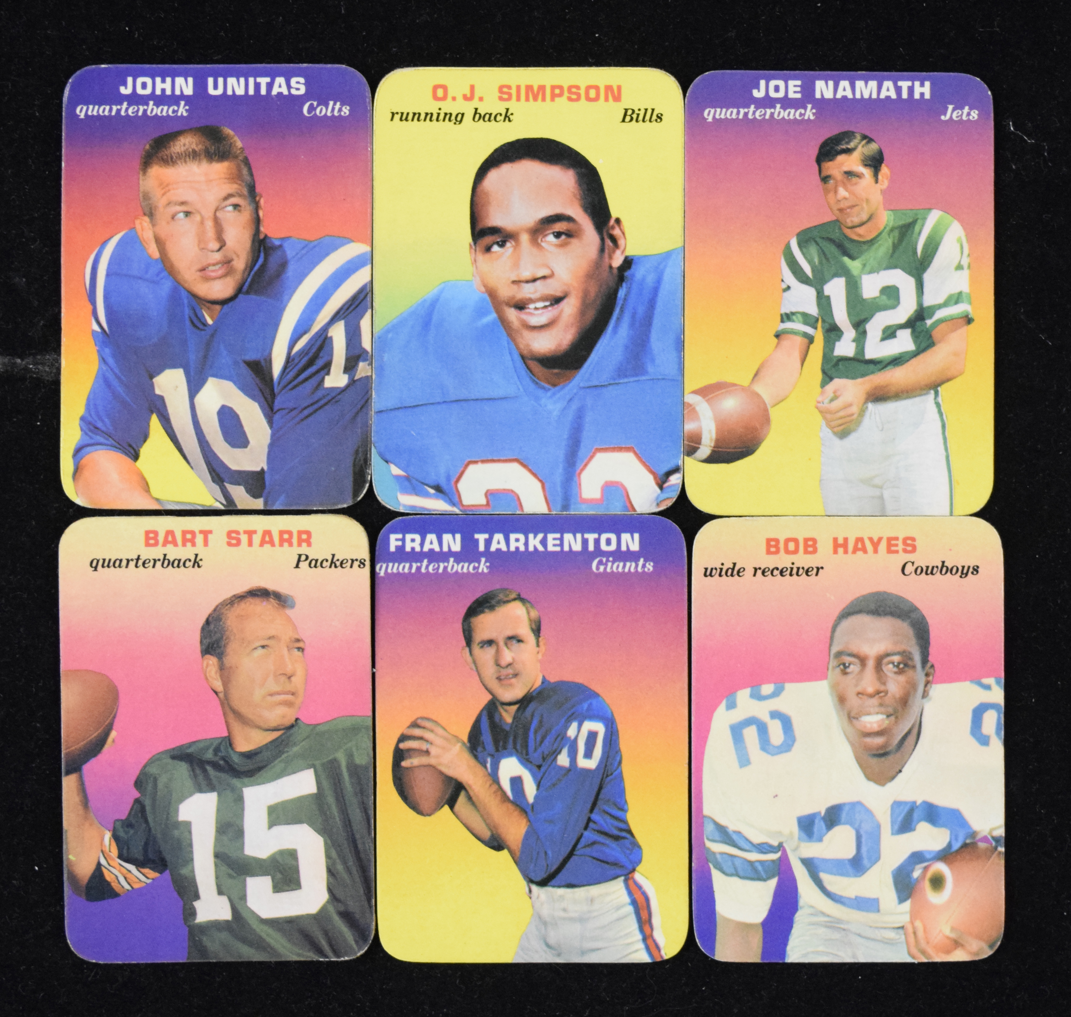 Description:1970 Topps Super Glossy football complete set (33) with Namath, Simpson and Unitas (FR-NM). Set of (33) Super Glossy inserts features several notable Hall of Famers, including Johnny Unitas, Bob Hayes, Bart Starr, Fran Tarkenton, Sonny Jurgensen, O.J. Simpson, Len Dawson, Joe Namath and more. Most appear EX-EX/MT. Range: FR-NM.
