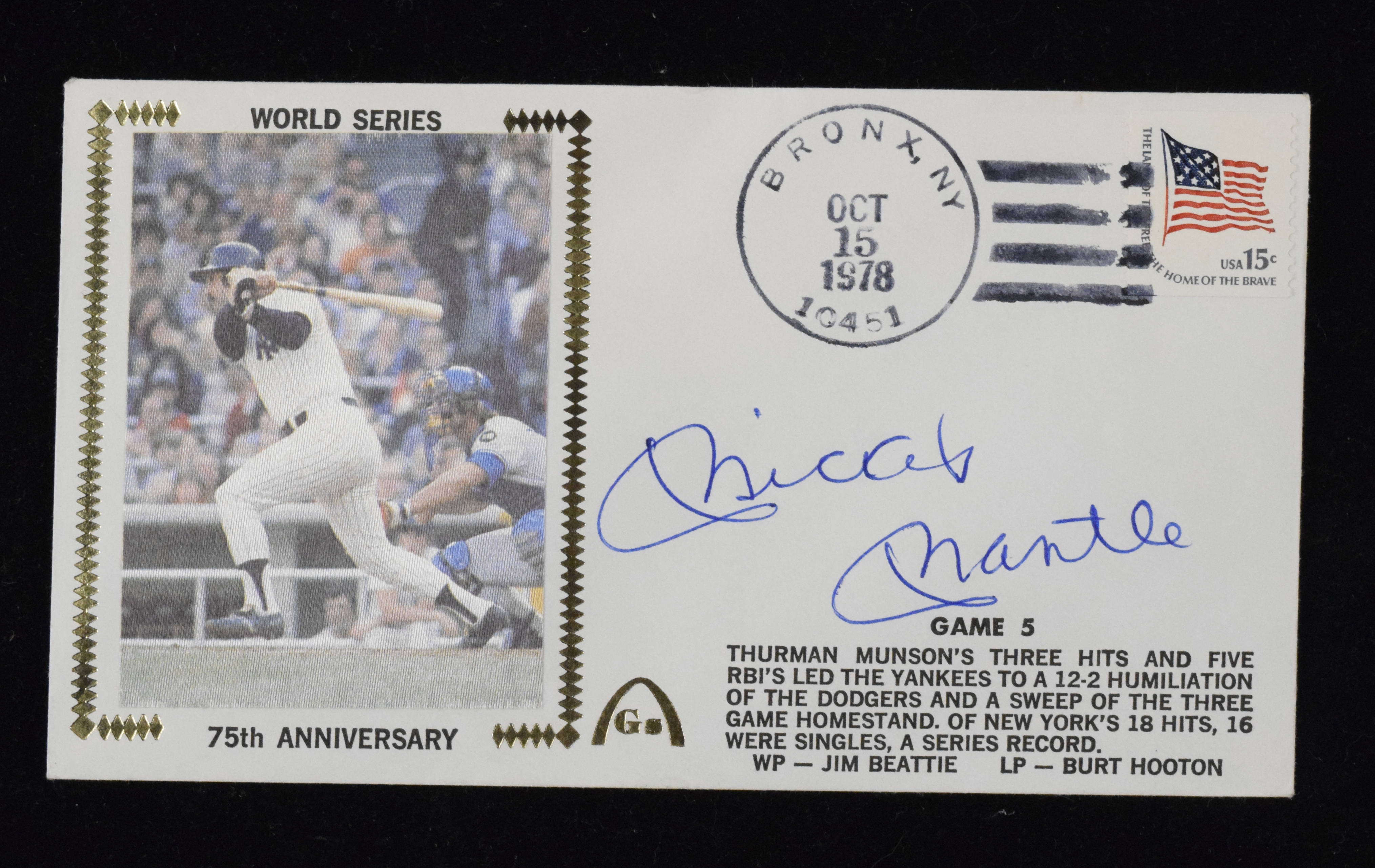 Description:Mickey Mantle autographed 1978 postal cover (Sig. MT). Postal cover postmarked Oct. 15, 1978 commemorating Game 5 of the World Series has been signed in blue ink by Mickey Mantle, rating 9 out of 10. Postal cover has light wear: EX/MT.