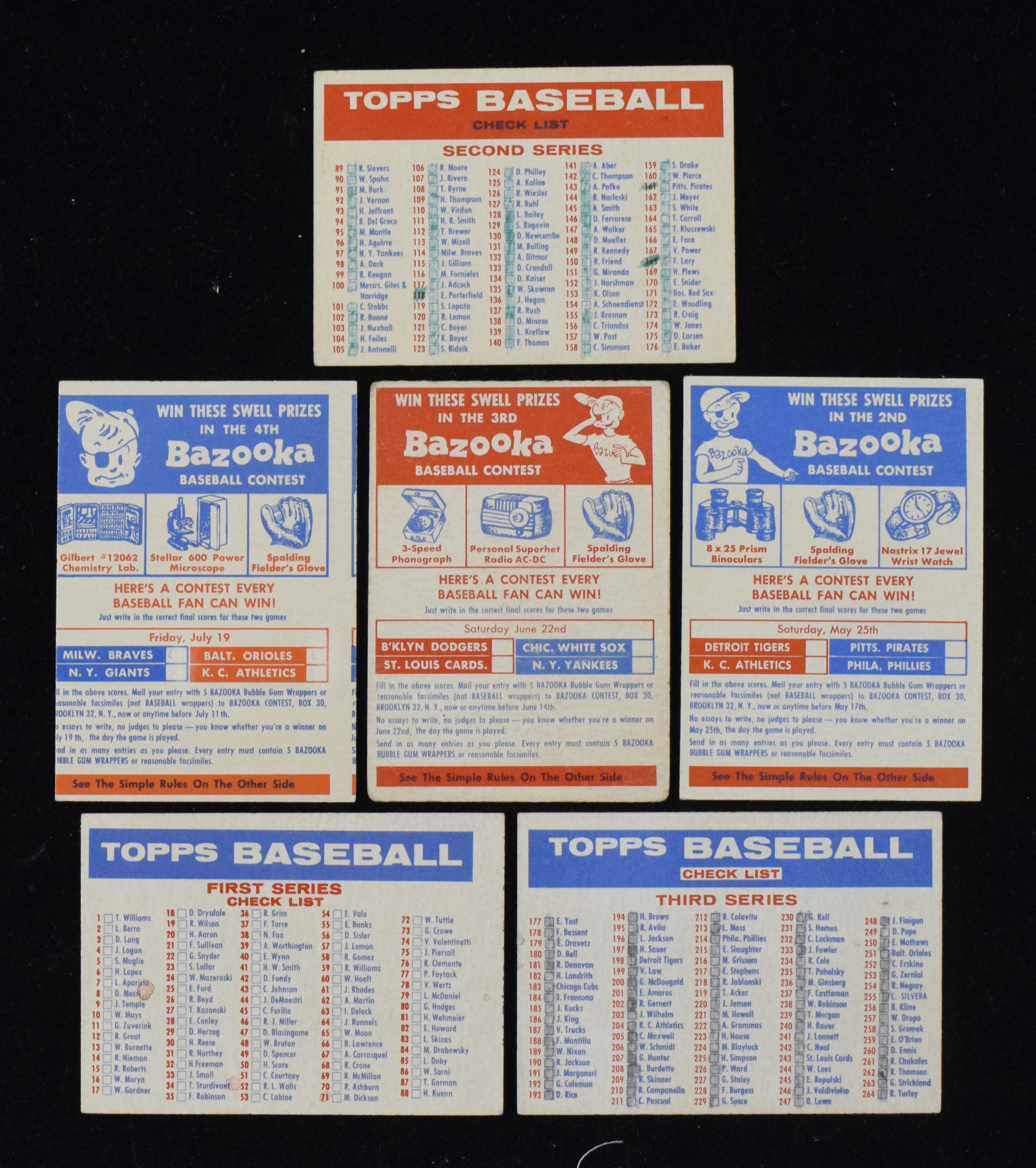 Description:Lot of (8) 1957 Topps checklists and Contest Cards (PR-EX). Tough-to-find lot includes (1) Third Series checklist, Bazooka (PR, marked); (2) First Series checklists, Big Blony (PR, marked and VG, unmarked); (1) Second Series checklist, Bazooka (PR, marked); (1) July 19 Contest Card, (PR/miscut, marked); (2) May 25 Contest Cards (VG and EX) and (1) June 22 Contest Card (GD). Range: PR-EX.