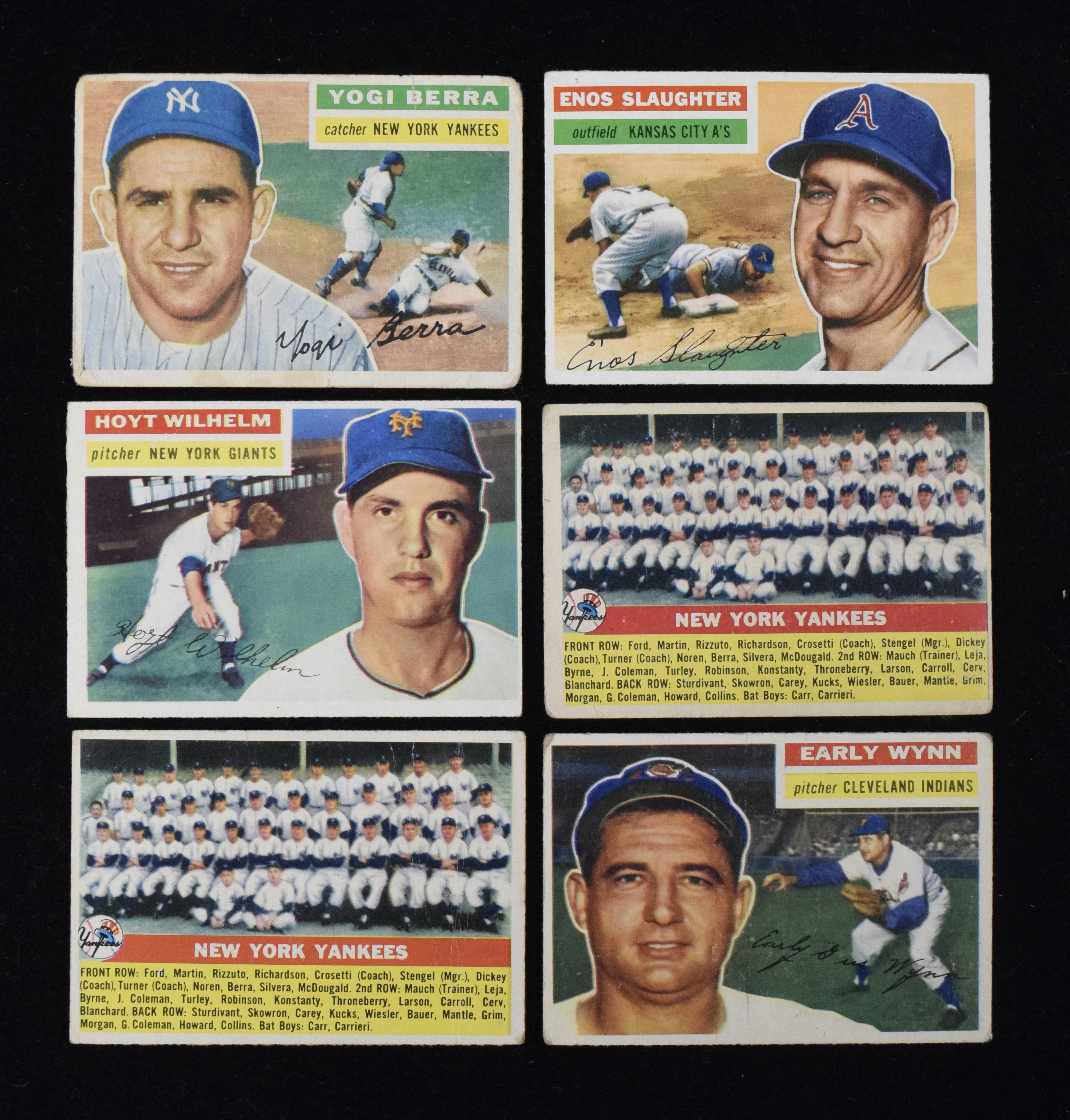 Description:Lot of (38) 1956 Topps cards with HOFers and checklists High-value but generally low-grade assortment of 1956 Topps cards is highlighted by #s 187 Early Wynn, 2 Warren Giles, 110 Yogi Berra (small ink mark on reverse), (2) 109 Enos Slaughter, 194 Monte Irvin, (2) 307 Hoyt Wilhelm and (25) team cards, including (2) 251 N.Y. Yankees, (2) 226 N.Y. Giants, (3) 11 Chicago Cubs, (2) 121 Pittsburgh Pirates (one with small ink mark on reverse) and more. Most appear GD-VG. Range: PR-VG/EX, including a few with ink marks.