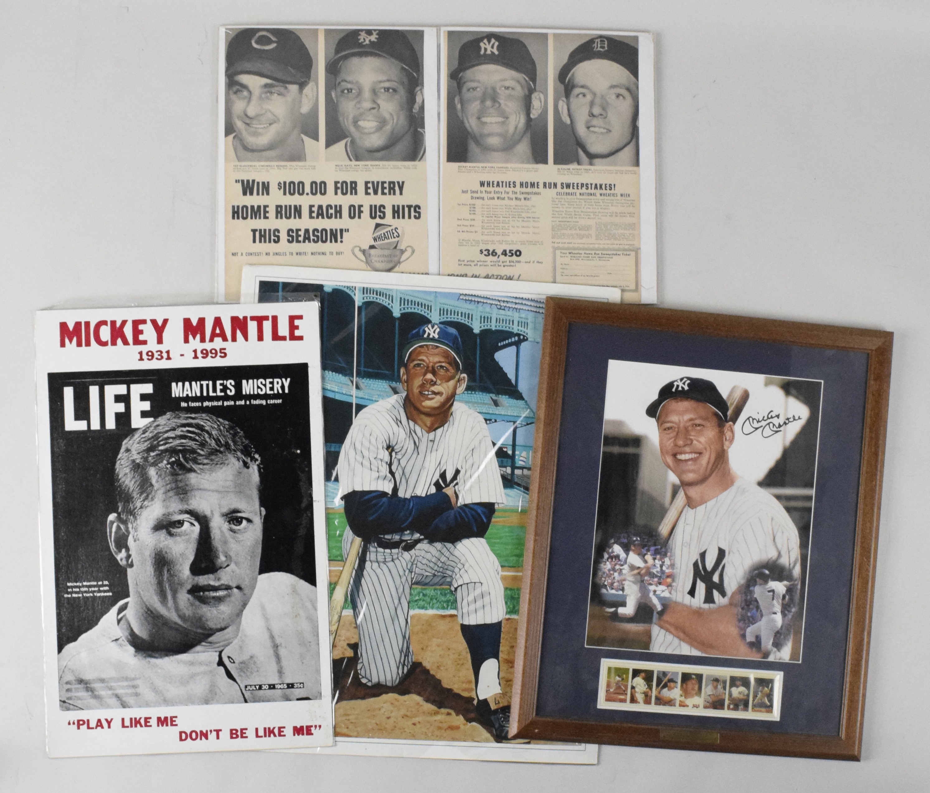 Description:Lot of (9) Mickey Mantle prints and posters, including framed (VG/EX-NM). Lot of assorted prints featuring the Yankees icon range in size from 28"x23" to 20"x16," with (1) Baseball Life Stories; (1) B&W art print; (3) color art prints (one is framed) ; (1) memorabilia collage poster; (1) Life magazine cover print; (1) c. 1950s Wheaties advertisement magazine cutout with Mays, Kaline and Kluszewski; and (1) framed photo print with stamps display. Range: VG/EX-NM.
