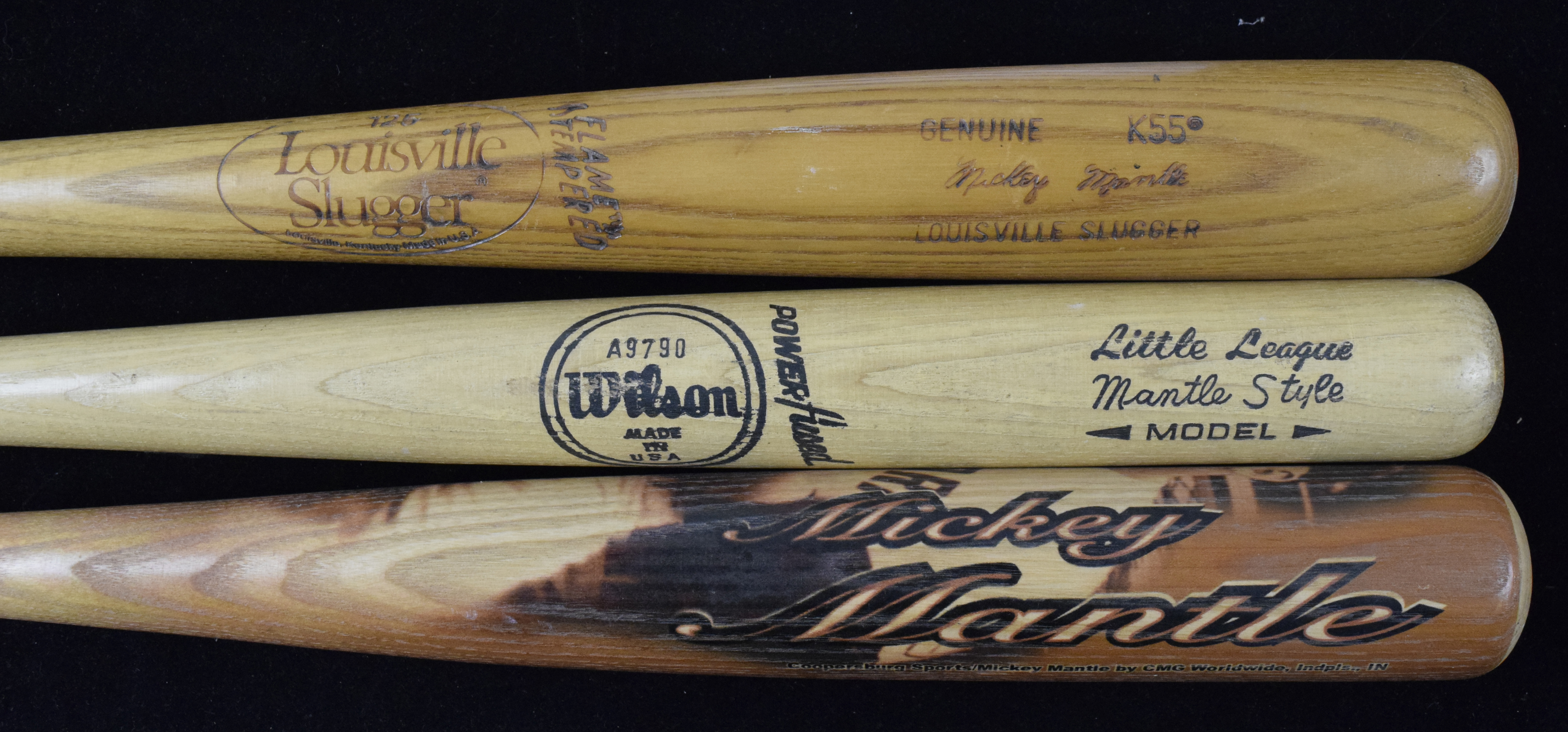 Description:Lot of (3) Mickey Mantle store model bats (EX-NM). Lot includes (1) 34" Coopersburg Sports Mantle photo/logo bat; (1) c.1960s 33" Louisville Slugger K55 Mantle store model bat; and (1) c. 1960s 30" Wilson Little League Mantle Style model bat. Range: EX-NM.