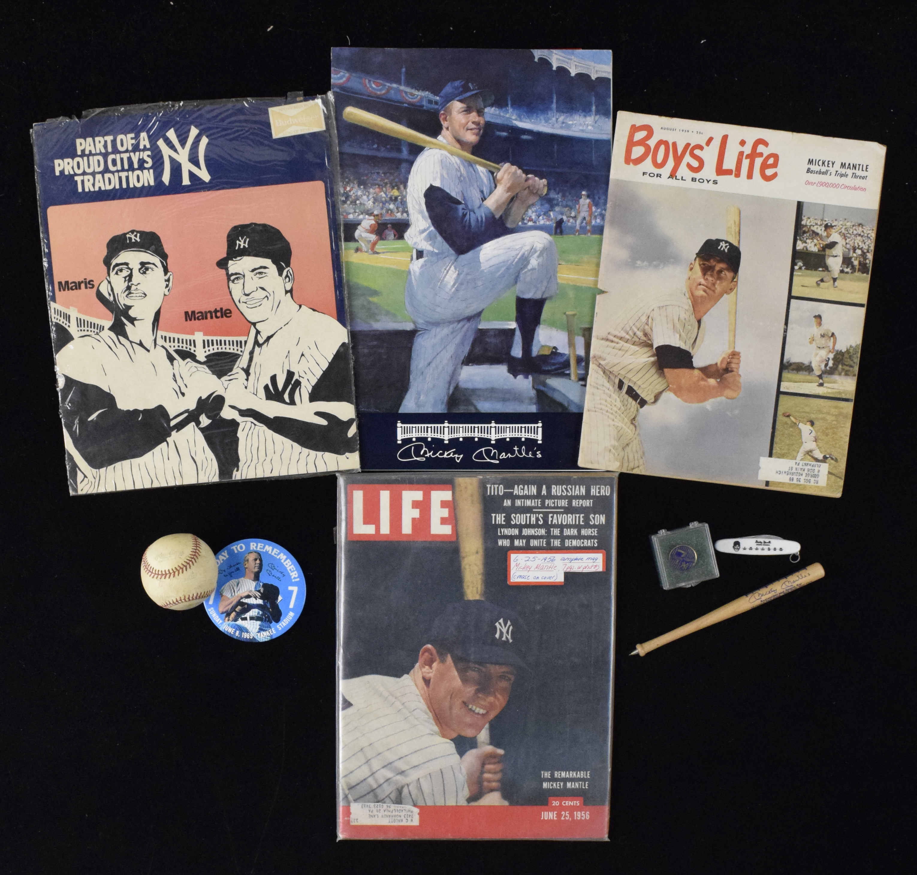 Description:Small group of assorted vintage and modern Mickey Mantle memorabilia (VG/EX-NM). Lot devoted to the Yankees icon is highlighted by (20) 1996 Topps empty cereal boxes; (1) Rawlings Mickey Mantle Official League baseball (toned); souvenir baseballs with facsimile signatures; (6) 1991 Magnum Comics comic books and other comic books; pocketknife, buttons and pins; Mickey Mantle's Restaurant menu; (2) 1956 Life Magazines with Mantle covers and various other magazines and publications; mini-bat pens; magazine advertising cutouts and other advertising; art prints; commemorative baseball cards and more. Range: VG/EX-NM