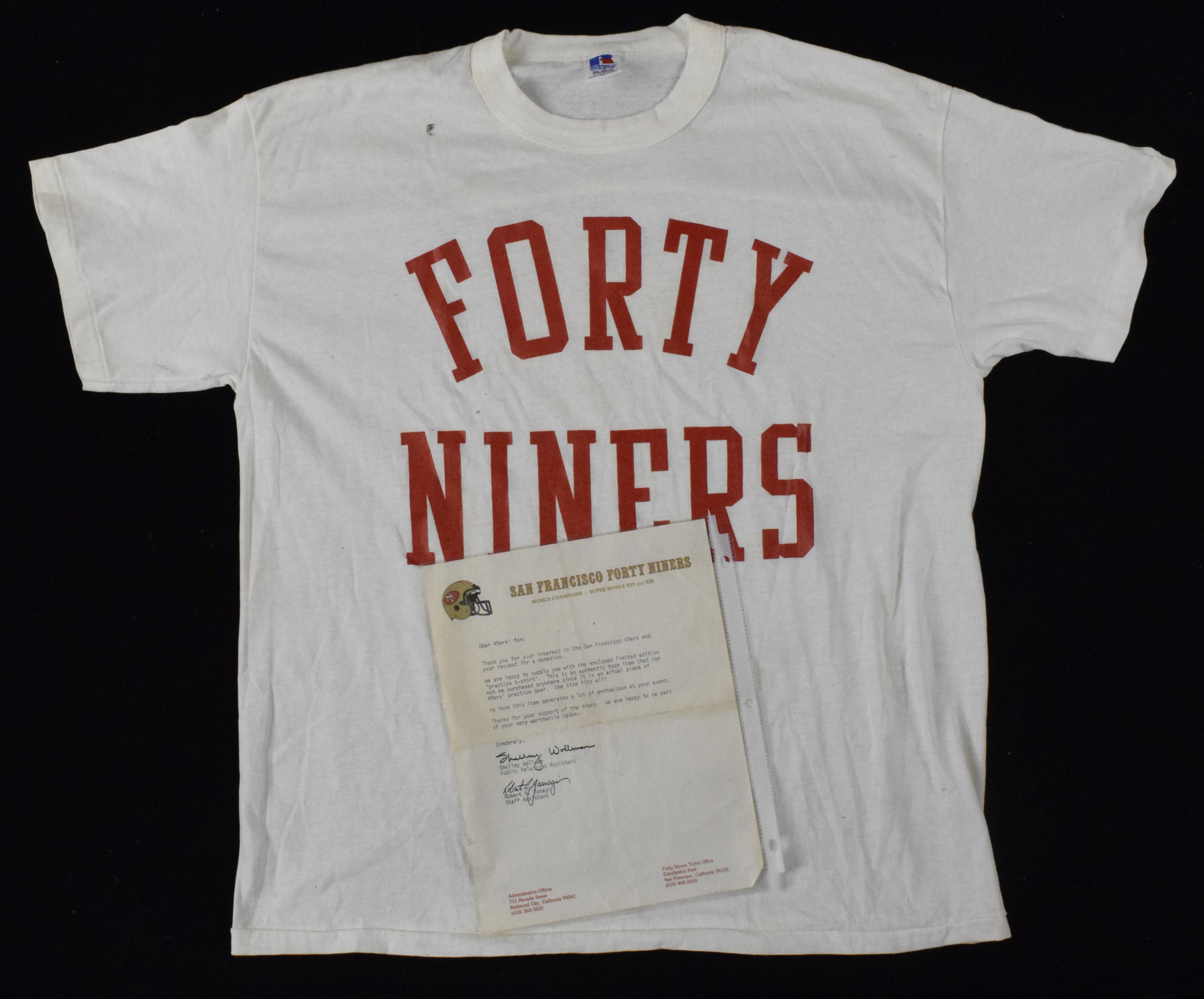 Description:San Francisco 49ers practice T-shirt with 49ers LOA, c. 1980s (EX/MT). C. 1980s Size XL Russell Athletic T-shirt has screened-on "Forty Niners" graphic in red. Includes letter on San Francisco 49ers letterhead attesting that the shirt is a "practice t-shirt" and an "authentic team item that cannot be purchased anywhere since it is an actual piece of 49ers' practice gear." Shirt has light wear: EX/MT.