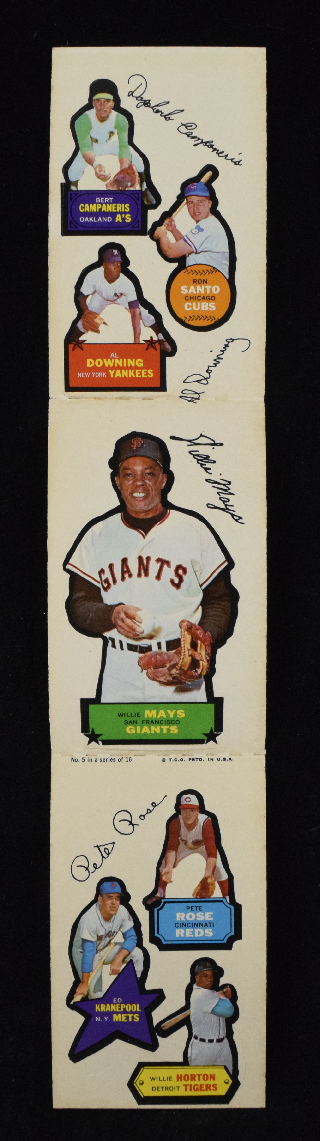 Description:1968 Topps Action All-Star Sticker complete panel with #5 Willie Mays (EX). Scarce 15 3/4" x 3 1/4" Topps test strip includes three unperforated panels with multi-player sections on the top and bottom and a large center panel with #5 Willie Mays with facsimile autograph. Additional stars and Hall of Famers include Ron Santo and Pete Rose. Panel has excellent eye appeal, though it is centered to the left and is downgraded by several minor flaws, including light indentations on the surface and edges. Highly desirable collectible is among the scarcest of the Topps test issues: EX. ($500-$750)
