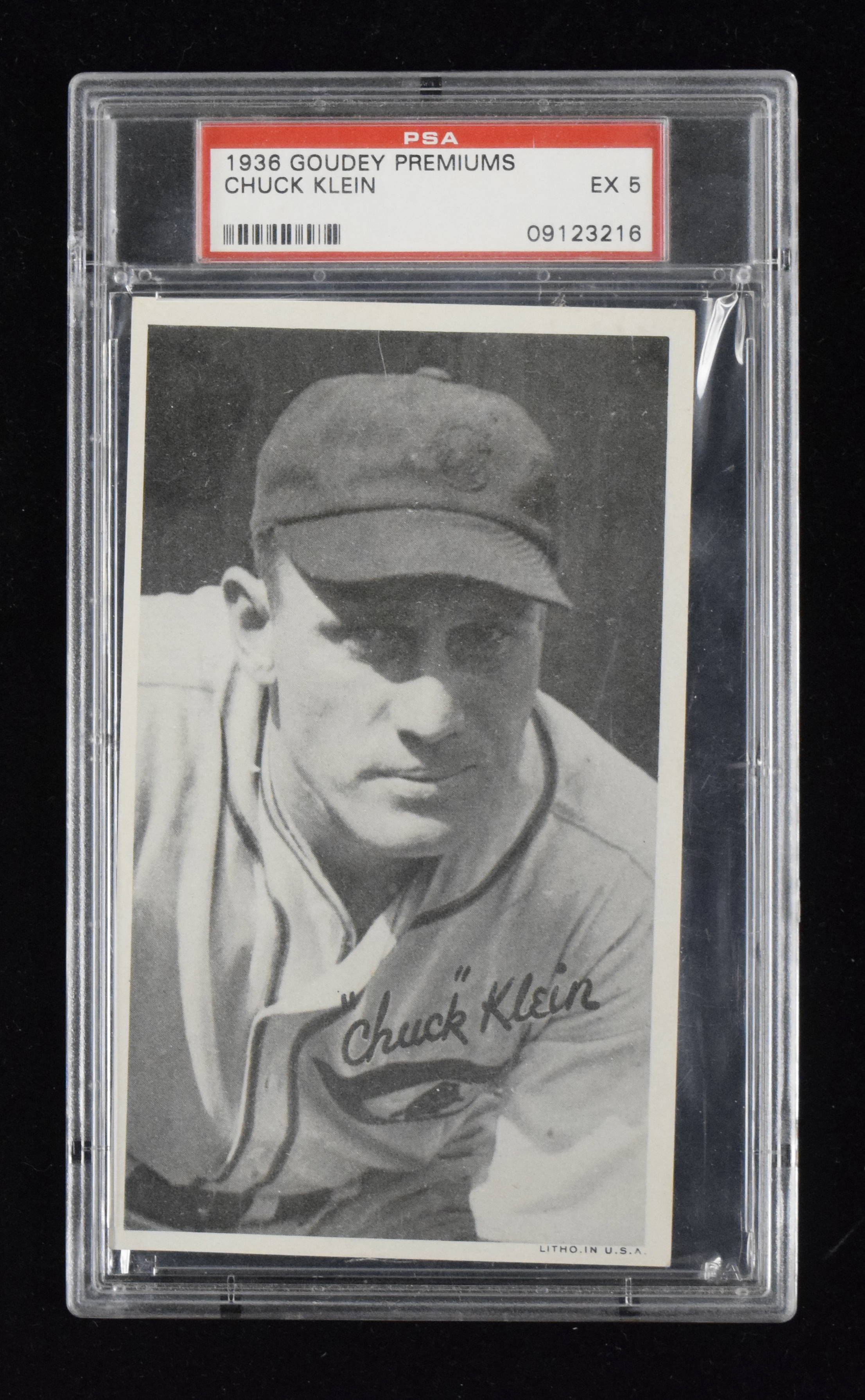 Description:1936 Goudey Premiums Chuck Klein (PSA 5 EX). Nice mid-grade card of the Hall of Famer is centered slightly to the left with four touched corners. Blank back is clean: PSA 5 EX.