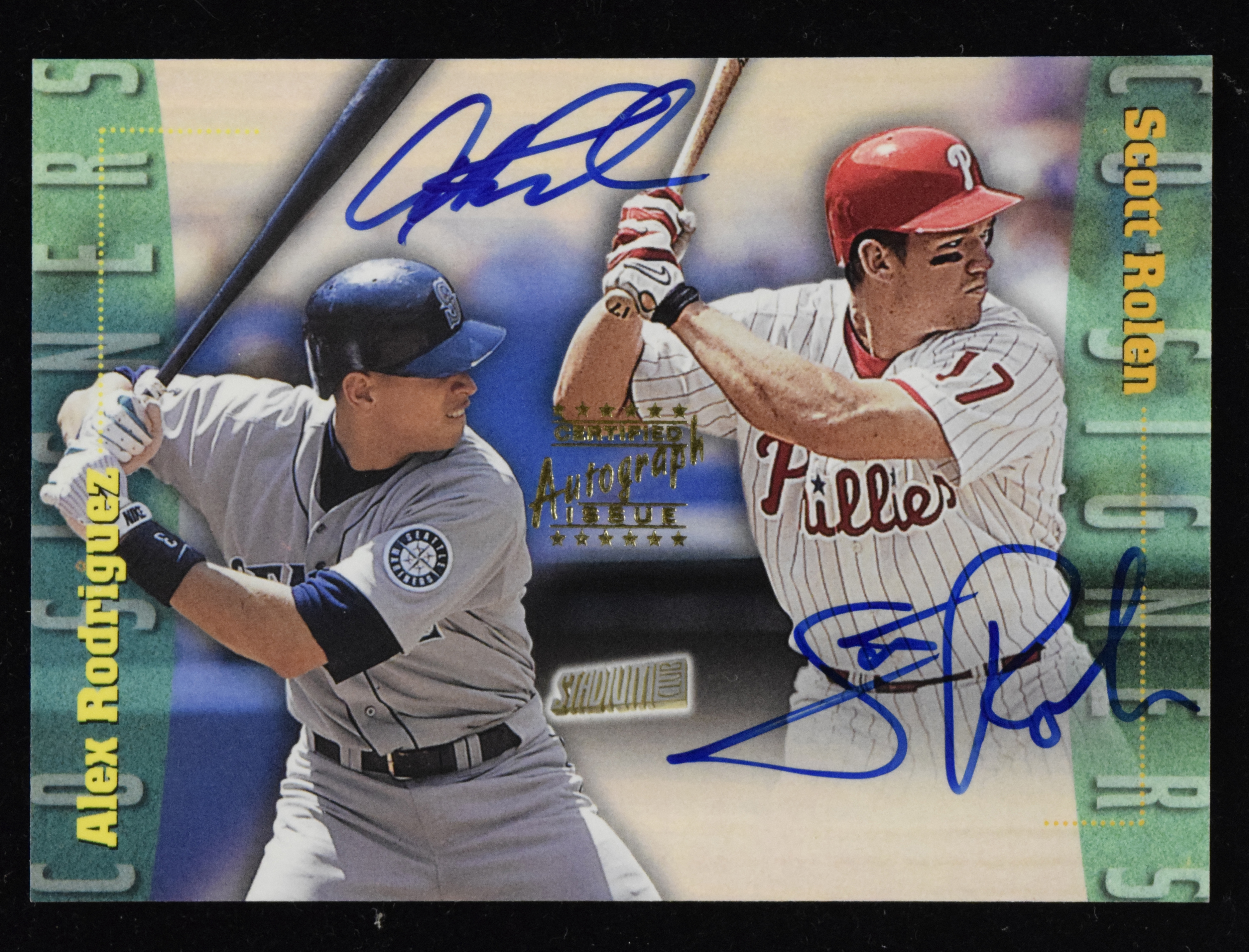 Description:1999 Topps Stadium Club Co-Signers Alex Rodriguez and Scott Rolen dual certifield autograph card (MT). Stadium Club #CS3 card has been signed on the front in blue marker by Alex Rodriguez and Scott Rolen, rating 9/10 out of 10. Card with Topps Certified Autograph stamp appears MT.