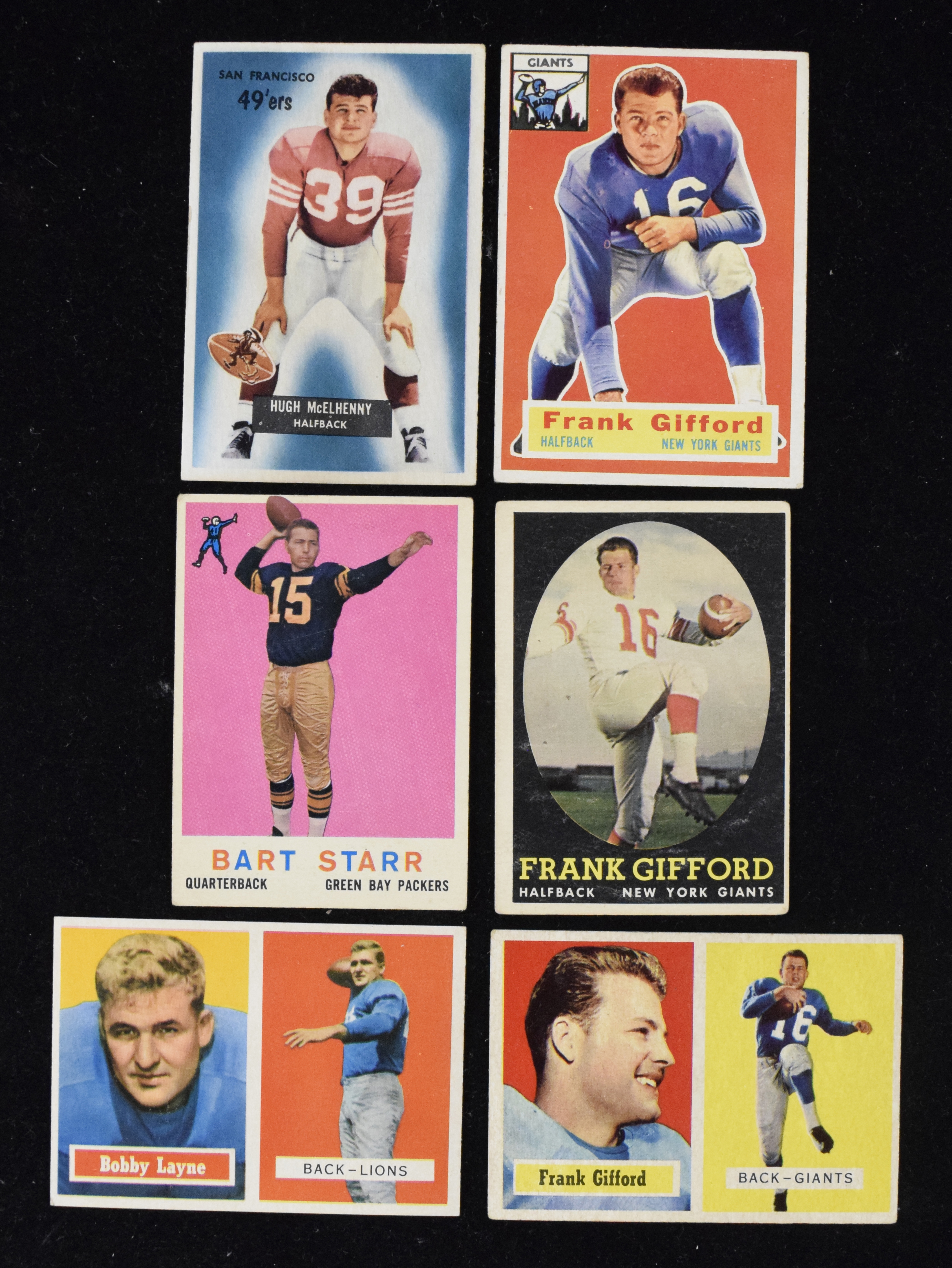 Description:Lot of (22) 1954-1959 FB mostly stars and HOFers, with Starr, Gifford and Layne (PR-VG/EX). Lot includes (1) 1954 Bowman #75 Hugh McElhenny; (1) 1956 Topps #53 Frank Gifford; (5) 1957 Topps: #s 88 Frank Gifford, 65 Art Donovan, 92 Ernie Stautner, 85 Dick Lane RC and 32 Bobby Layne; (4) 1958 Topps: #s 106 Art Donovan, 120 Raymond Berry and (2) 73 Frank Gifford; and (11) 1959 Topps: #s 60 Lou Groza, 51 Sam Huff RC, 82 Paul Hornung, 23 Bart Starr, 86 Art Donovan, 55 Raymond Berry, 174, 31, 63, 40 Bobby Layne and 140 Y.A. Tittle. Most appear VG with some better and some worse. Range: PR-VG/EX.
