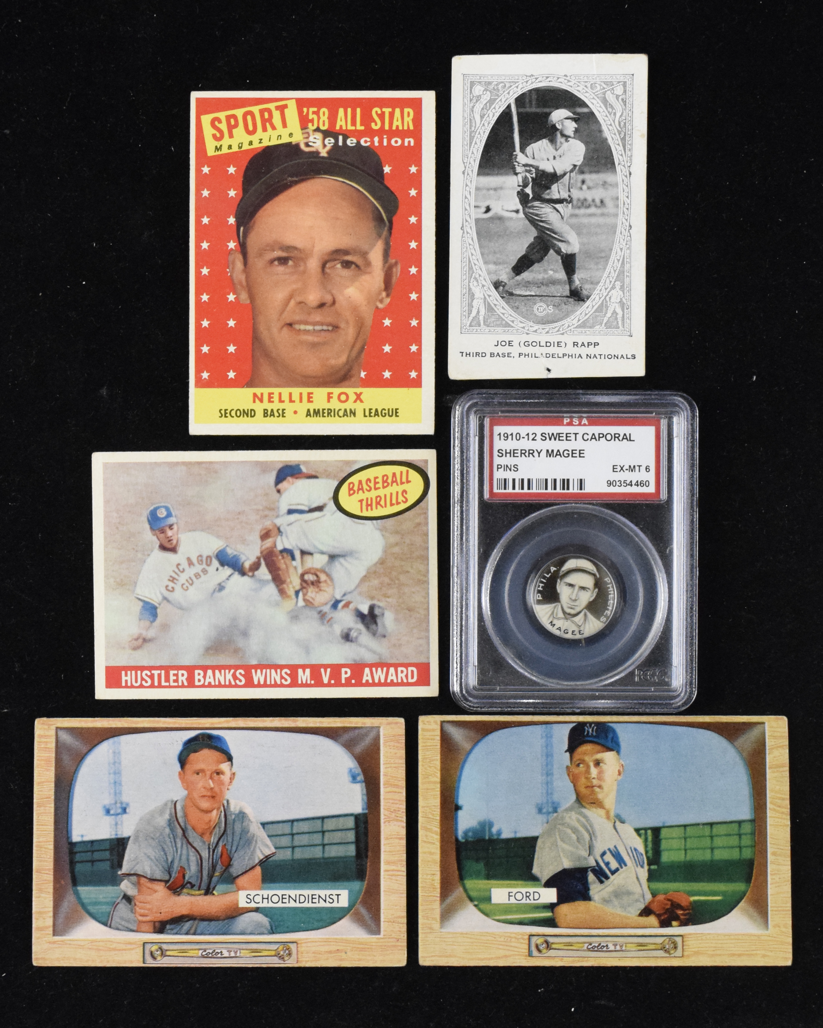 Lot of (11) 1910-1959 cards & pin, including Sweet Caporal Pins Sherry Magee PSA 6 (PR-EX/MT). Includes (1) 1910-12 Sweet Caporal Pins Sherry Magee (PSA 6 EX/MT); (1) 1922 W573 strip card Goldie Rapp (PR; scrapbook residue on reverse); (1) 1949 Eureka Stamps Hank Borowy (EX); (1) 1953 Bowman B&W #35 Johnny Wyrostek (FR); (4) 1955 Bowman cards: #s 1 Hoyt Wilhelm (PR), 29 Red Schoendienst (FR), 59 Whitey Ford (VG) and 110 Bob Miller (VG/EX); (1) 1958 Topps #479 Nellie Fox AS (EX OC) and (2) 1959 Topps: #s 469 Ernie Banks Thrills (VG/EX) and 147 Cubs Clubbers with Ernie Banks (FR). Range: PR-EX OC