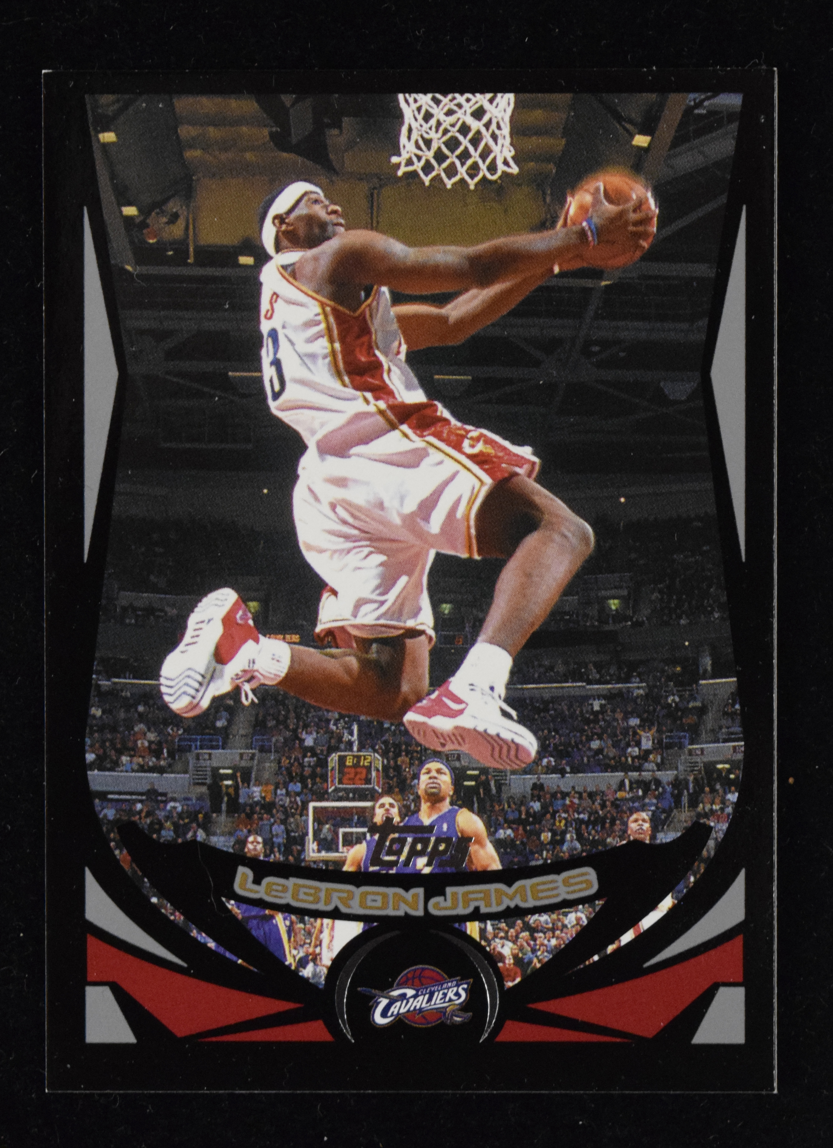 Description:2004-05 Topps Black #23 LeBron James (418/500) (NM/MT). 2nd-year card of the superstar is slightly off-center top-to bottom with four razor-sharp corners and beautiful gloss. Back is serial-numbered 418/500 and clean: NM/MT.