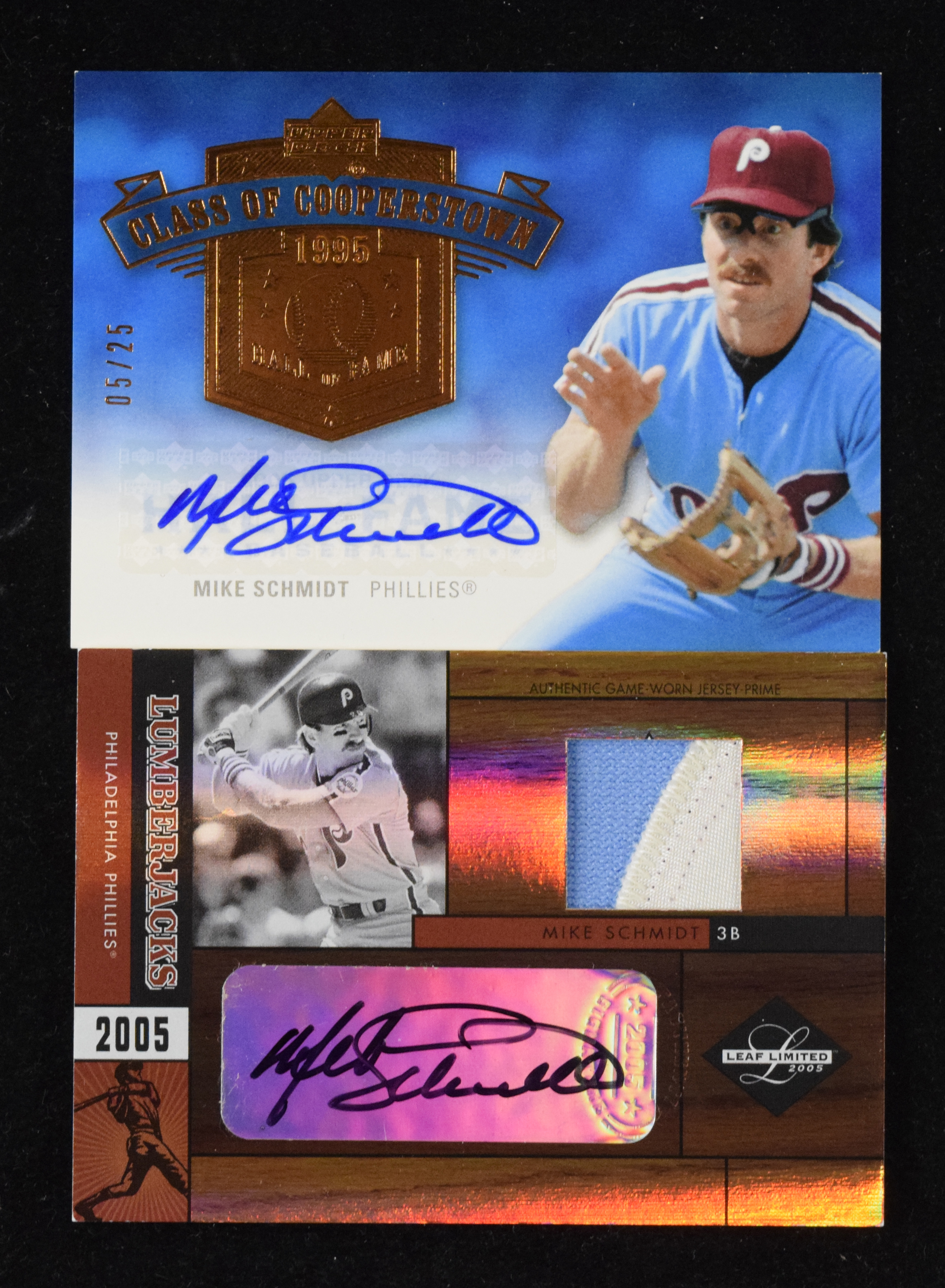 Description:Lot of (2) Mike Schmidt certified autograph cards, (8/10 & 5/25) (EX/MT-NM/MT). Nice lot of serial-numbered pack-pulled certified autograph cards, each signed by Phillies great Mike Schmidt. Includes (1) 2005 Leaf Limited Lumberjacks #LJ-25 with two-color jersey patch (#d 8/10; EX/MT); and (1) 2005 Upper Deck Class of Cooperstown #CC-MS2 (#5/25; NM/MT). Signatures rate 9 out of 10. Cards: EX/MT-NM/MT.