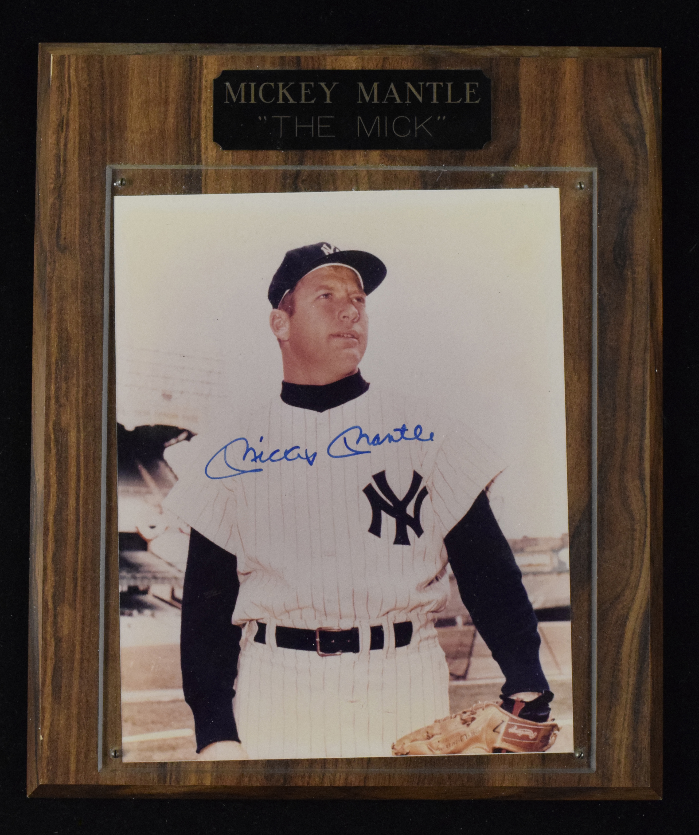 Description:Mickey Mantle autographed 8"x10" photo plaque (Sig. MT). 8"x10" photo has been signed by Mantle in blue marker, rating 9/10 out of 10. Photo has been mounted to a wooden plaque measuring approx. 11"x14." Photo has little to no wear: NM.
