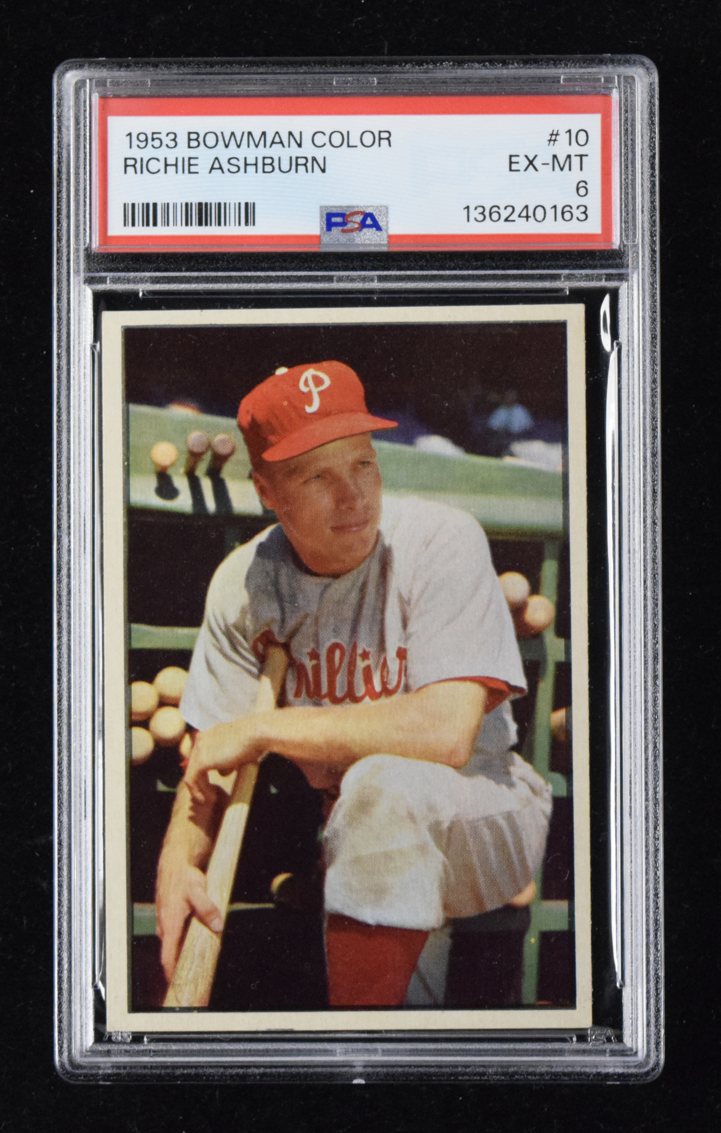 Description:1953 Bowman Color #10 Richie Ashburn (PSA 6 EX/MT). Nicely centered card of the Hall of Famer has just the slightest hints of wear to the corners with beautiful color and a sharply registered image. Back has a small spot of wax staining, likely accounting for the technical downgrade: PSA 6 EX/MT.