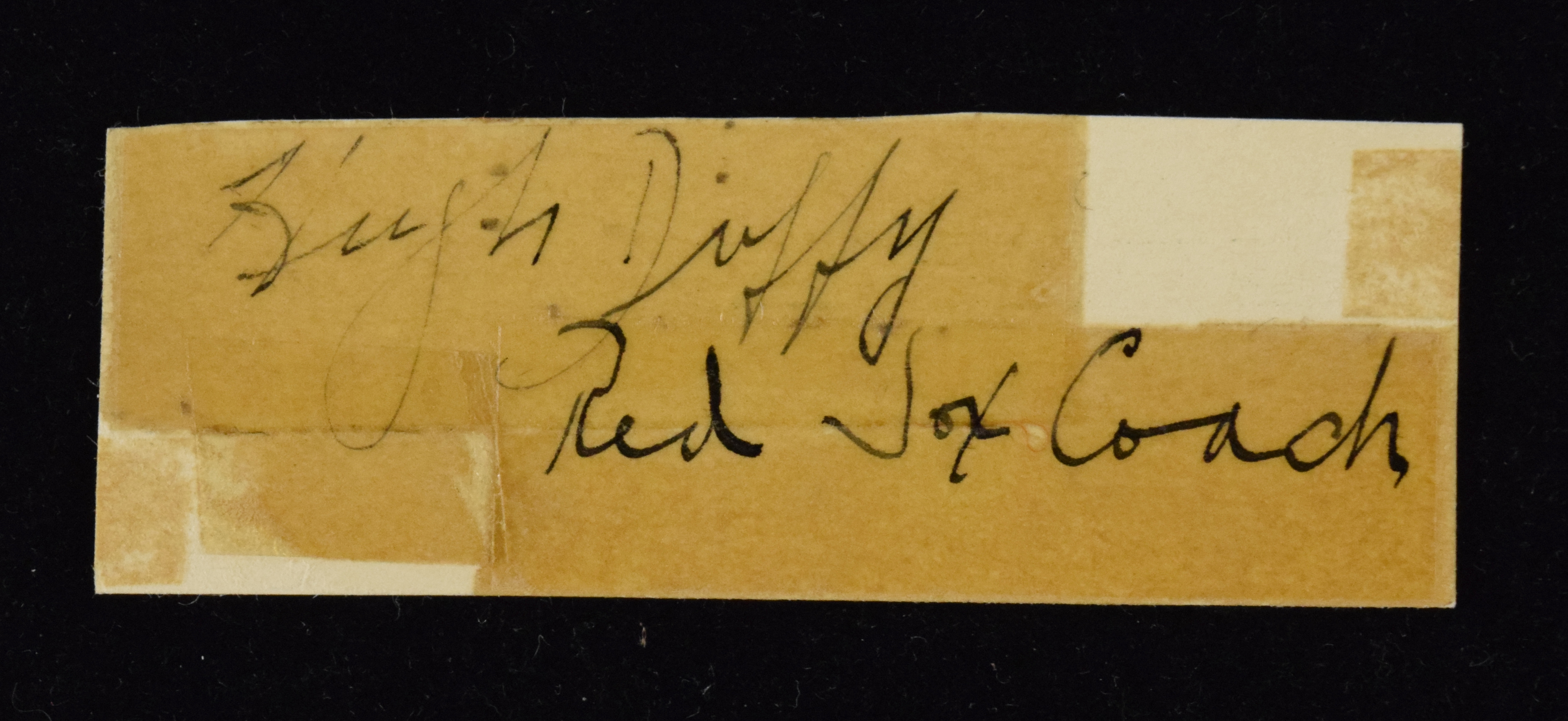 Description:Hugh Duffy taped cut signature (Sig. EX/MT). Cut has been signed by the Hall of Famer "Hugh Duffy Red Sox Coach," rating 6 out of 10. Nearly the entire cut signature has been taped over: FR.