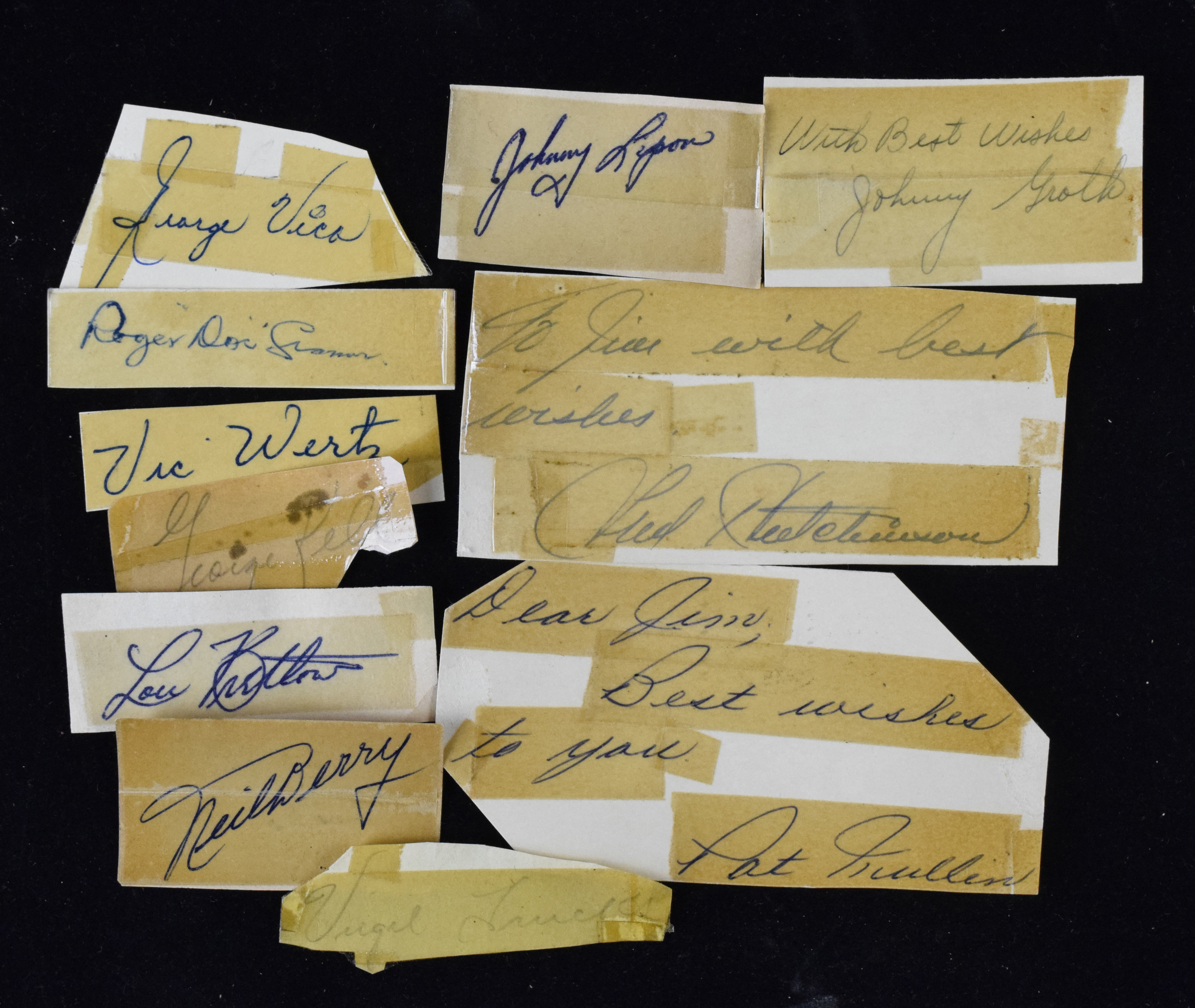Description:Lot of (16) c. 1940s Detroit Tigers cut signatures (Sigs. EX/MT-NM/MT). Assortment of cut signatures from the 1940s Detroit Tigers teams, with each taped over. Includes Vic Wertz, Roger Doc Cramer, Johnny Lipon, George Vico, Dizzy Trout, Tom Bridges, Don Kolloway, Hoot Evers, Dick Wakefield, Virgil Trucks, Neil Berry, Pat Mullin (personalized), Johnny Groth, George Kell, Lou Kretlow and Fred Hutchinson. Also includes original mailing envelope for the cuts the Detroit Baseball Company. Signatures range from 6 to 8 out of 10 (avg. 7) and cuts range FR-GD (taped).