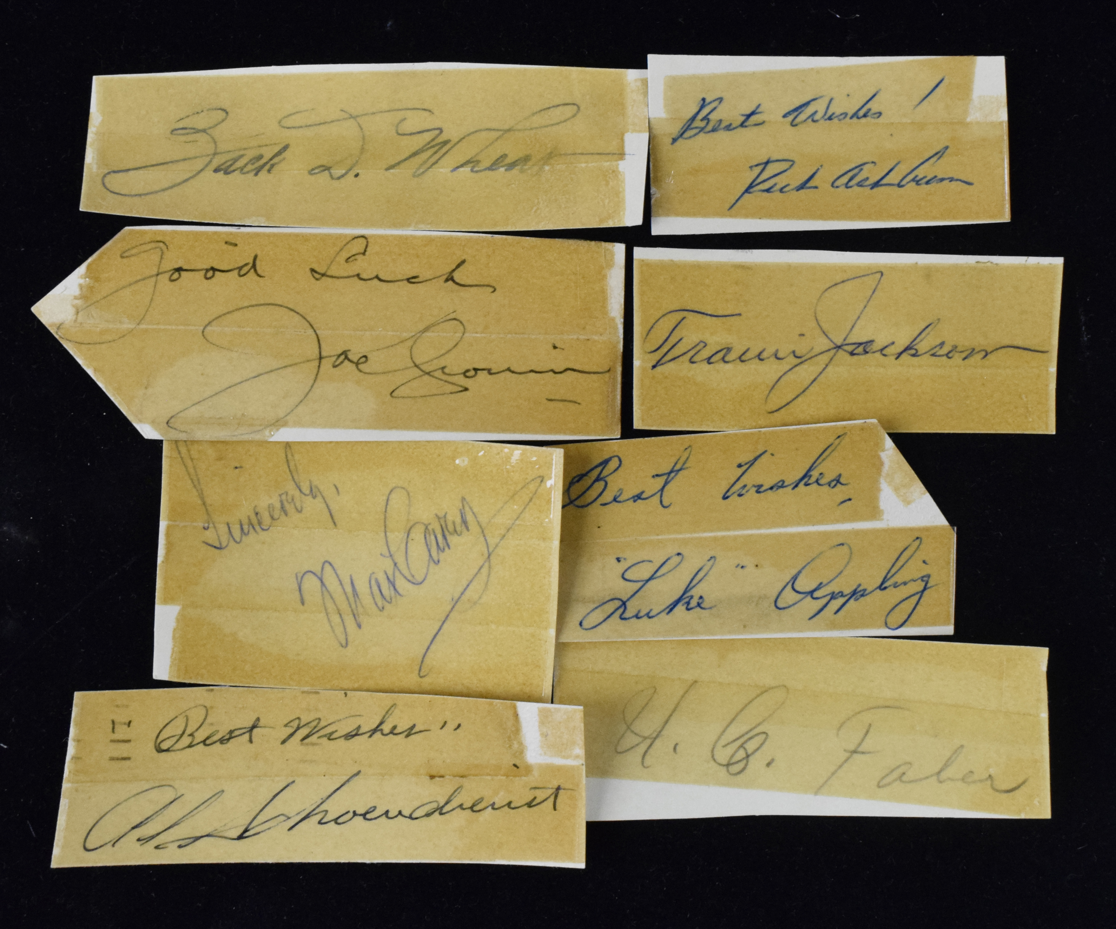 Description:Lot of (10) HOFer cut signatures, including Zack Wheat, Joe Cronin (Sigs. NM-NM/MT). Nice assortment of Hall of Famer cut signatures, each of which has been taped over. Includes Earl Averill, Joe Sewell, Richie Ashburn, Max Carey, Red Faber, Zack Wheat, Joe Cronin, Travis Jackson, Luke Appling and Red Schoendienst. Signatures rate 7/8 out of 10 and cuts range FR-GD (taped).