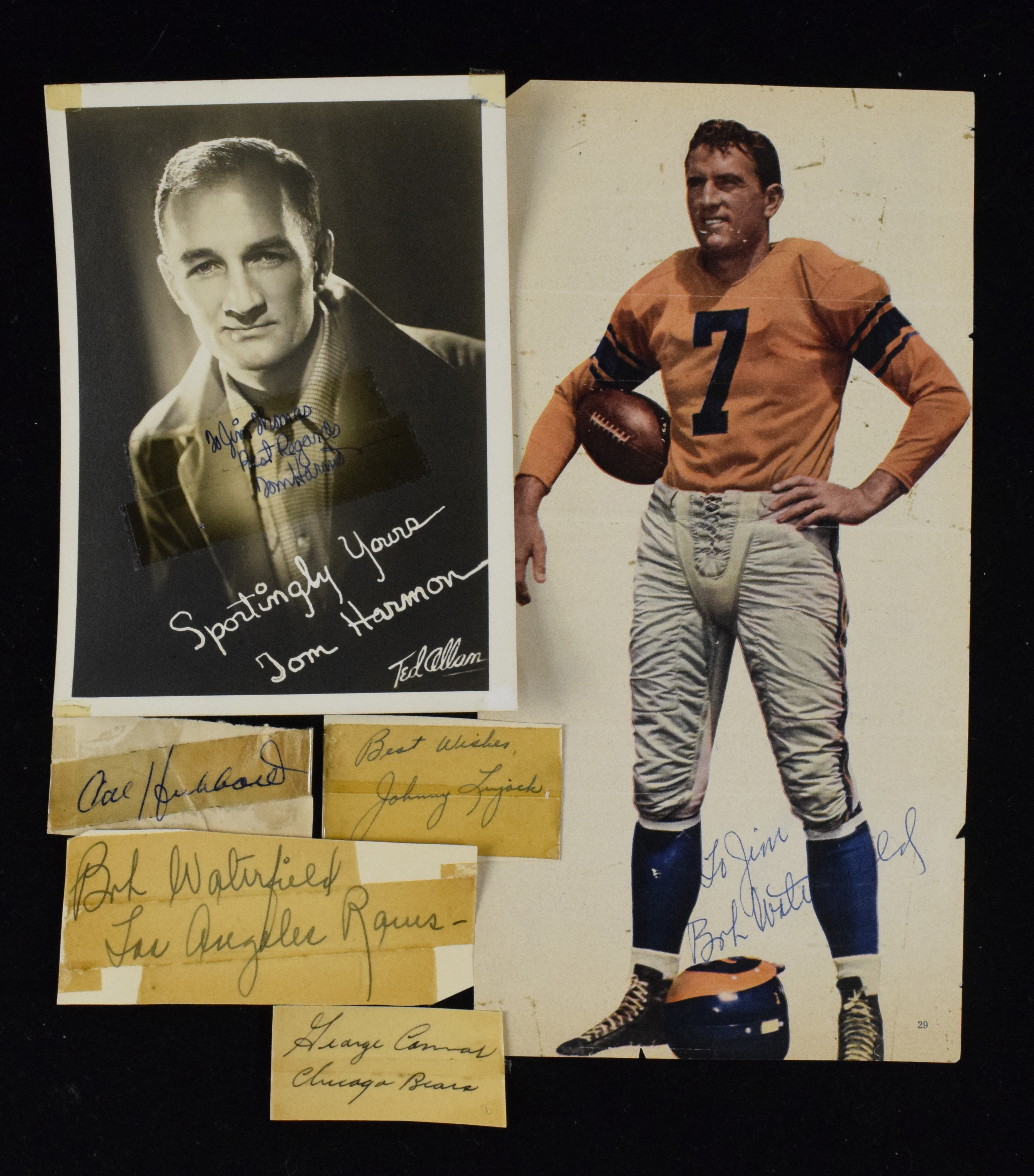 Description:Lot of (14) football autographs, including Tom Harmon, Johnny Lujack, Bob Waterfield (Sigs. EX-NM). Most items are cut signatures that have been taped over, with some on magazine cutouts and a few other pieces. Signatures include Doc Blanchard, Charlie Conerly, (2) Bob Waterfield, Tom Harmon, Leon Hart, George Connor, Bill Dudley, Carl Hubbard, Glenn Davis, Don Penza, Charley Brickley. Signatures range from 5 to 7 out of 10, and items range FR-GD (taped).