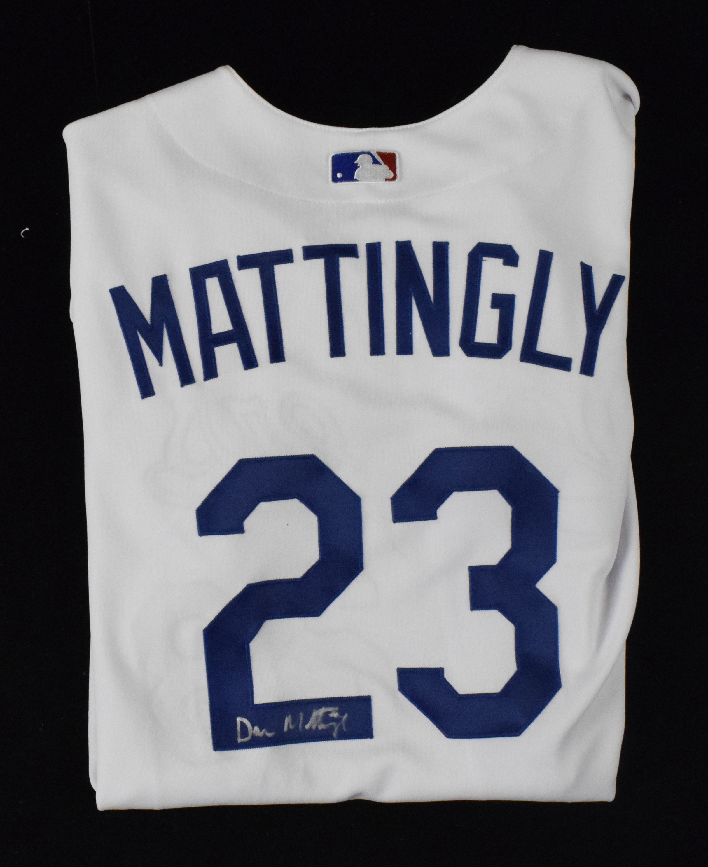 Description:Don Mattingly autographed L.A. Dodgers jersey with "0062" coded wash tag (EX/MT). Outstanding c. 2010 Majestic L.A. Dodgers Don Mattingly jersey was consigned to Hunt Auctions directly from a former MLB pitcher. Majestic size 48 tag is on the front tail, and interior wash tag displays proper "0062" code. A Dodgers 1st World Championship patch "55 Since '55" patch is one the right sleeve. Mattingly signed the back number in silver marker, rating 7 out of 10. Jersey has signs of light use/wash wear: EX/MT.