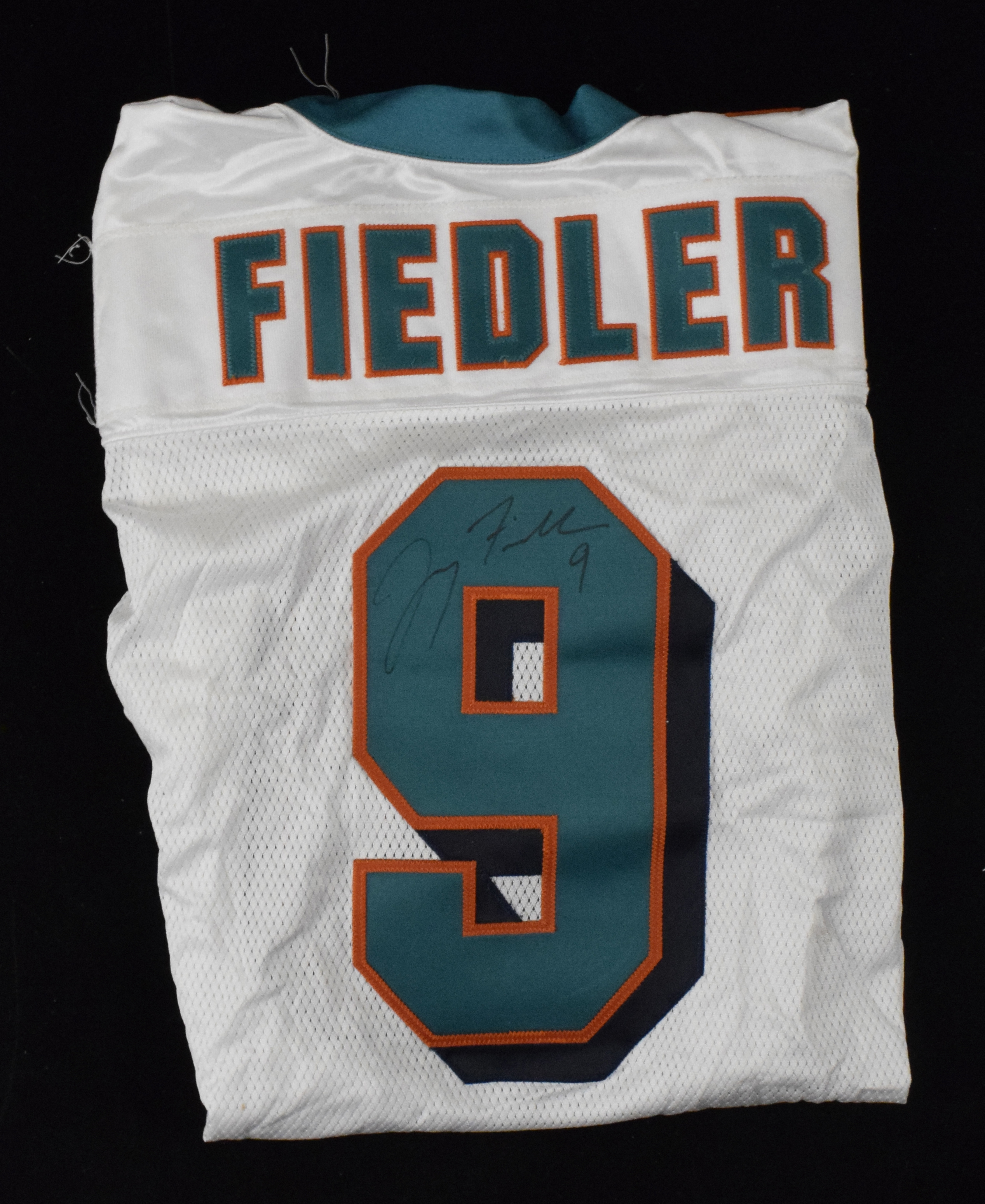 Description:2002 Jay Fiedler autographed Miami Dolphins professional model road jersey (EX). White mesh jersey has number "9" on front, back, and shoulders and a "Fiedler" nameplate across the back. In the collar is an "02-54" printed strip tag denoting year and size. Reebok On Field size 54 tagging is on the shirt tail. Fieldler, whose stint with the Dolphins included three 10+ wins in four seasons as QB, signed the back number in black marker with "9" inscription, rating 7 out of 10. There is evident usage and wash wear throughout, stitching has been added in several areas, with the hem partially stitched together: EX.