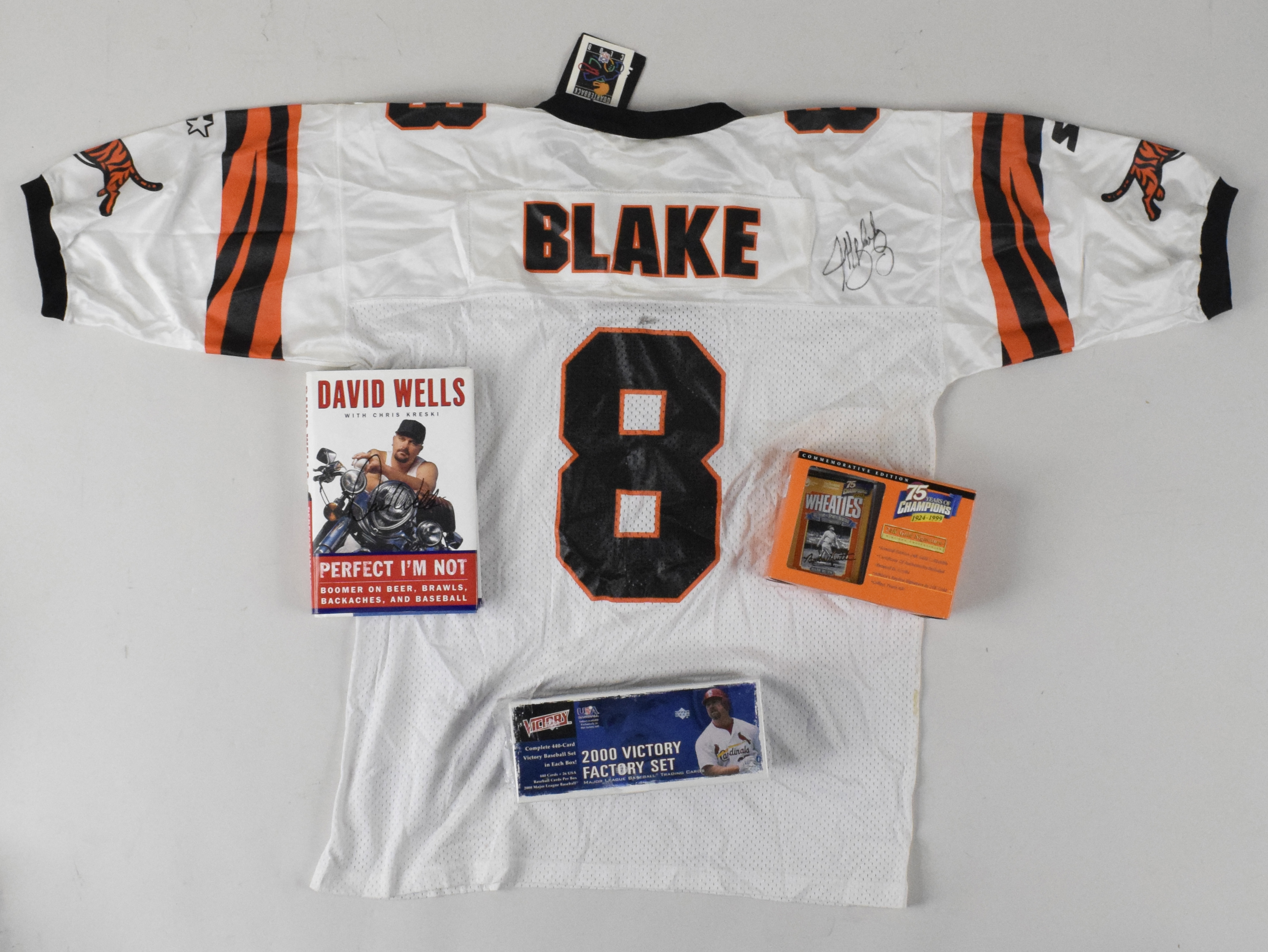 Description:Small group of cards and autographs, with Jeff Blake and David Wells signatures (EX-NM/MT). Lot include (1) 2000 Upper Deck Victory factory set (wrapping partially torn); (1) 1994 Spectrum The Miracle of 69 N. Mets factory-sealed card set; (1) 1992 Upper Deck Team MVP Holographic card set (open box); (1) 1995 A.L. Superstars Cal Ripken Jr. gold stamp set; (3) 1999 Wheaties 75 Collectibles mini gold signature boxes (2 Ruth and 1 Ali; all new in box); (1) David Wells hardcover book "Perfect I'm Not," signed on the front in black marker by Wells and (1) Starter size XL Cincinnati Bengals retail jersey signed on the back shoulder by Jeff Blake. Signatures rate 8/9 out of 10, and items range EX-NM/MT.