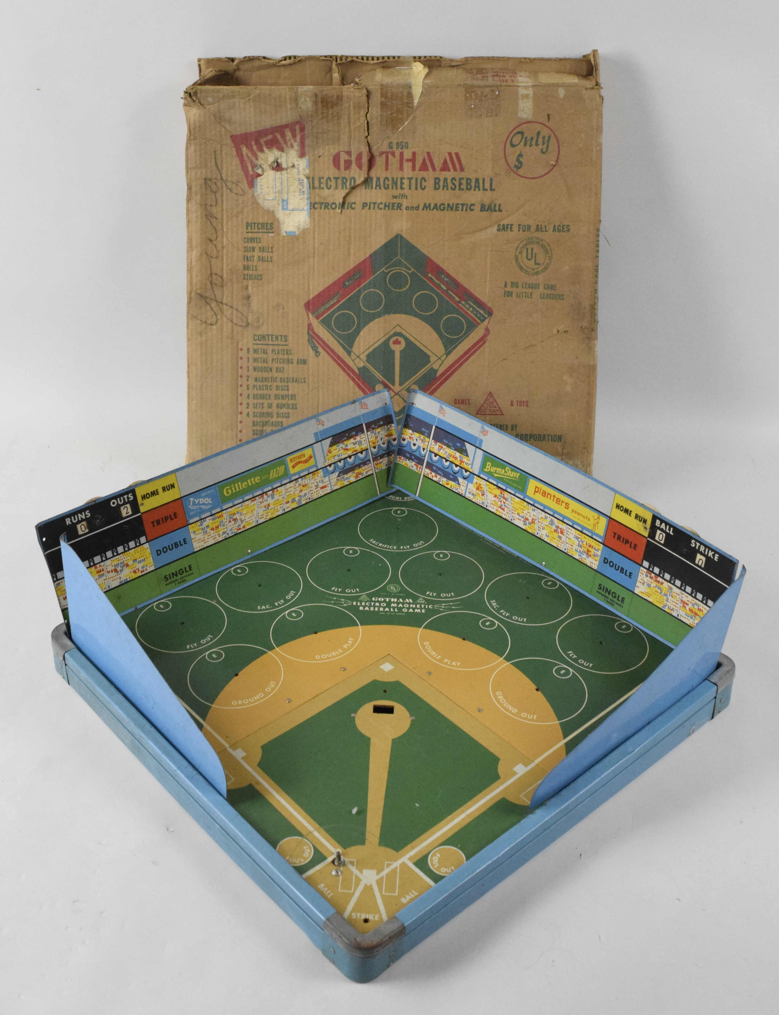 Description:Gotham Electro Magnetic Baseball Game in original box, c. 1955 (VG/EX). Electronic game does not appear to be in working order, and is missing some parts, though metal outfield signs are included. Includes original cardboard box (with tape and apparent water damage). Game: VG/EX (does not accept electrical current); Box: PR (water damage).