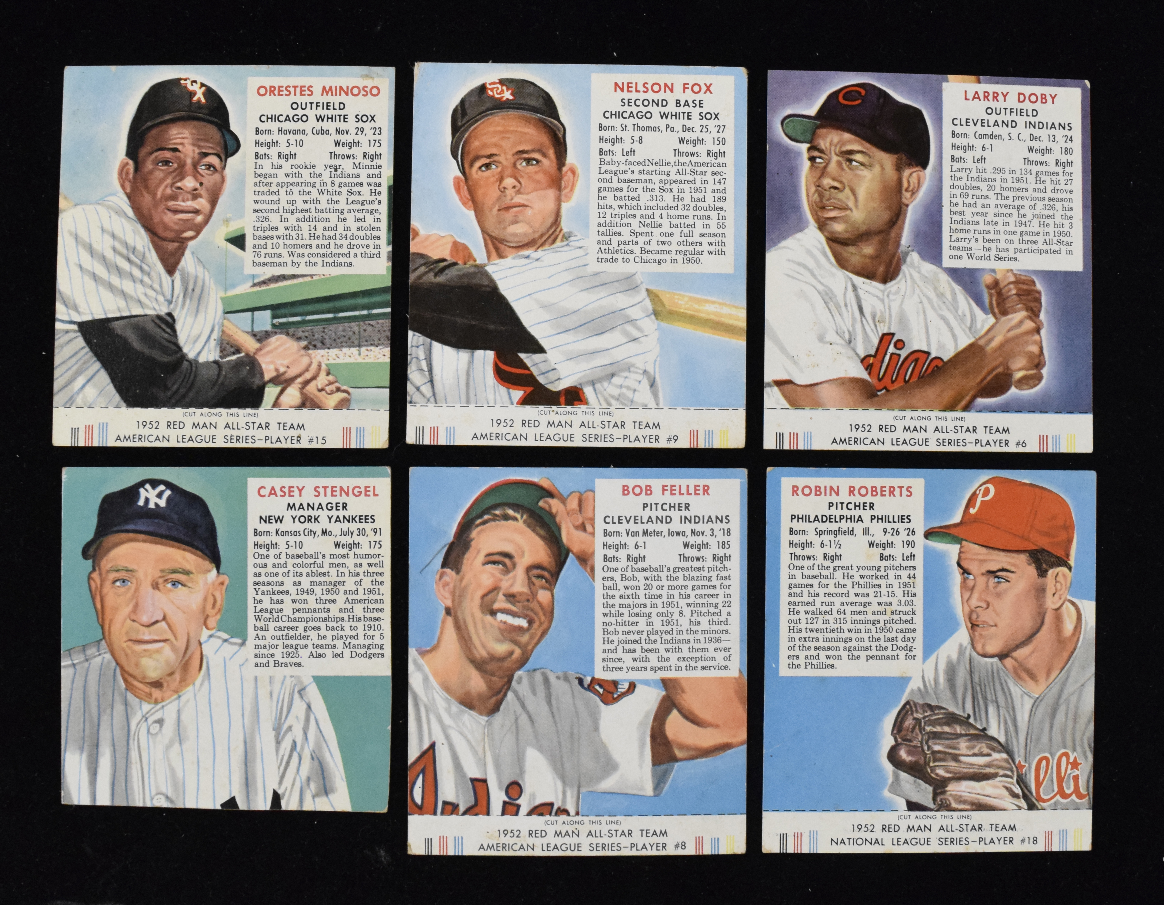 Description:Lot of (33) 1952 Red Man Tobacco cards with HOFers and (24) with tabs (PR-VG/EX). Nice quantity of Red Man Tobacco cards (with light duplication) includes (24) with tabs and (9) without tabs. With tabs: #s (2) AL2, NL3, NL4, AL 6 Larry Doby, NL6, AL8 Bob Feller, NL9 Monte Irvin, AL9 Nellie Fox, AL10, AL12, AL13 George Kell, NL13, AL14, AL15 Minnie Minoso, AL17, NL18 Robin Roberts, AL20, AL22, NL23, NL24, NL25, (2) NL26. Without tabs (hand-cut): AL15 Minnie Minoso, AL24 Early Wynn, AL20, NL19 Red Schoendienst, NL1 Leo Durocher, NL10, NL20 Enos Slaughter, NL12 Ralph Kiner and AL1 Casey Stengel. Most appear GD-VG with some better and some worse. Range: PR-VG/EX (including some hand-cut).