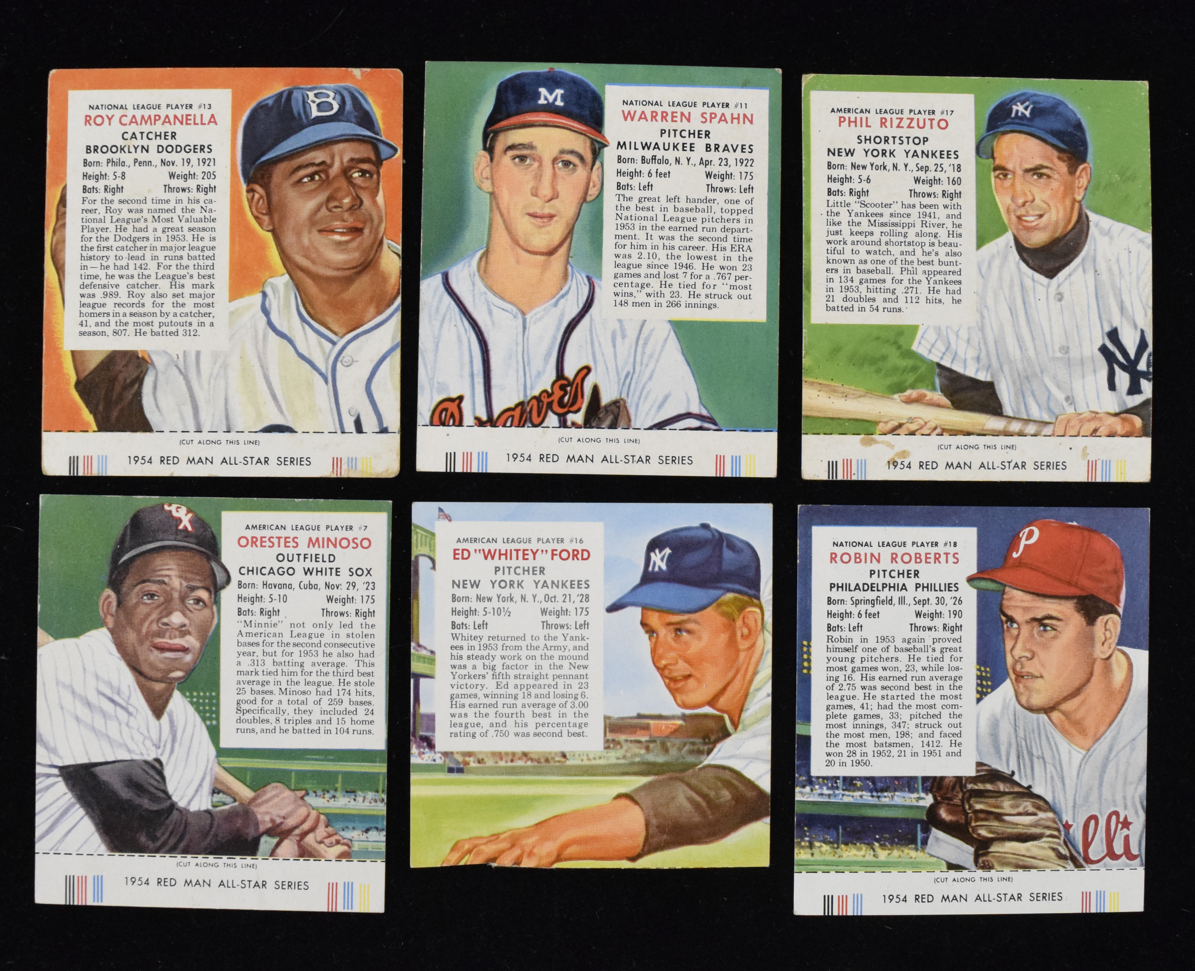 Description:Lot of (33) 1954 Red Man Tobacco cards with HOFers and (23) with tabs (PR-VG/EX). Nice quantity of Red Man Tobacco cards (with light duplication) includes (23) with tabs and (10) without tabs. With tabs: #s AL2, NL2, NL3, AL5, NL6 Ted Kluszewski, AL7 Minnie Minoso, NL7, AL9, AL10, NL10 Red Schoendienst, NL11 Warren Spahn, AL12, NL13 Roy Campanella,NL14, AL17 Phil Rizzuto, NL18 Robin Roberts, AL19, NL21, AL22, NL22 Gil Hodges, AL23, AL24, and AL15. Without tabs (hand-cut): AL3 Nellie Fox, NL6, NL22 Eddie Mathews, AL16 Whitey Ford, NL18 Robin Roberts, NL9, NL12, NL7, AL9 and AL19. Most appear GD-VG with some better and some worse. Range: PR-VG/EX (including some hand-cut).