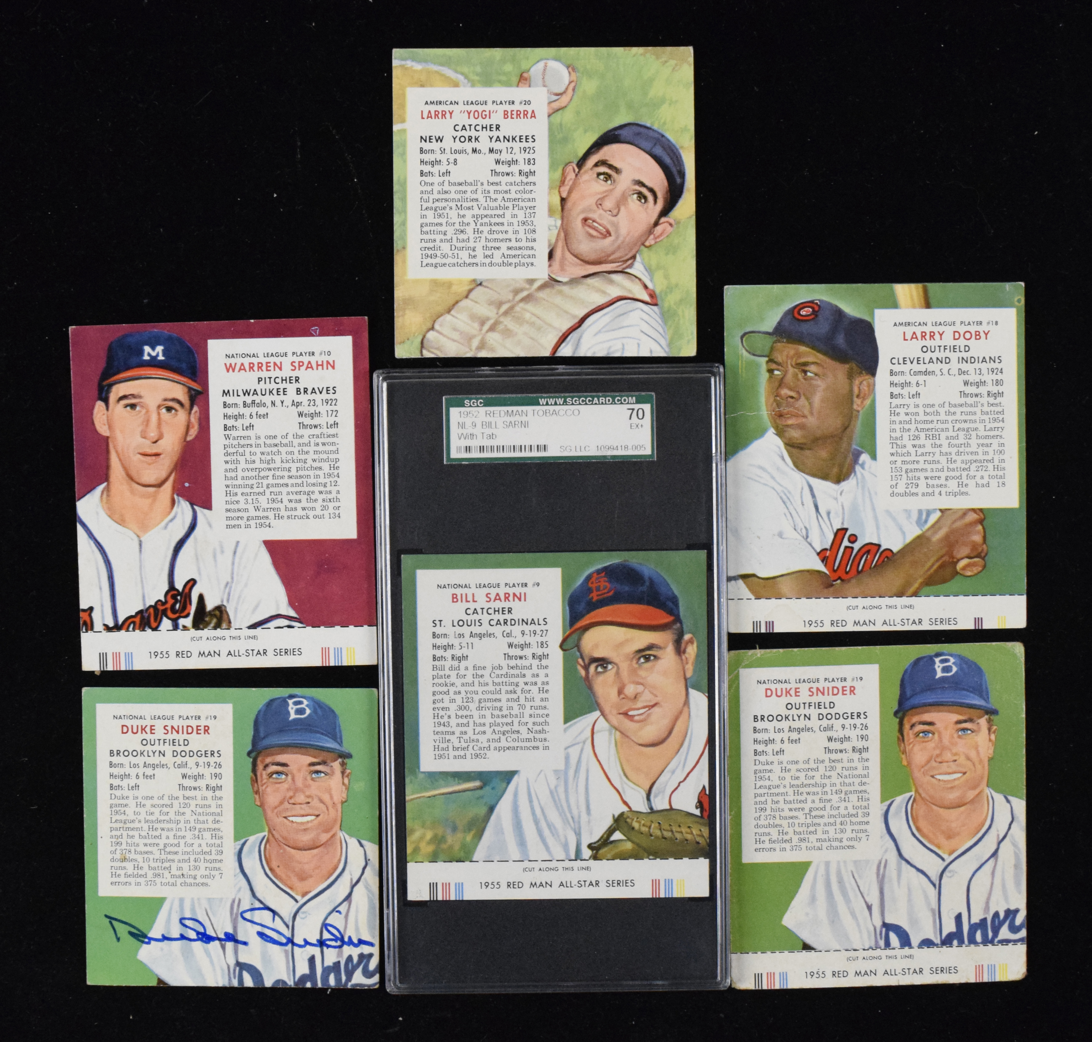 Description:Lot of (22) 1955 Red Man Tobacco cards with HOFers, Snider auto and (8) with tabs (PR-VG/EX). Nice quantity of Red Man Tobacco cards (with light duplication) includes (14) with tabs and (8) without tabs. With tabs: NL9 Bill Sarni (SGC 5.5 EX+; SGC flip incorrectly lists card as 1952), AL1, NL4, AL5, AL9, NL10 Warren Spahn, NL14, AL18 Larry Doby, NL18 Red Schoendienst, NL19 Duke Snider, AL20, NL22, NL23 and NL25. Without tabs (hand-cut): AL2, NL5, NL6 Ted Kluszewski, NL8, NL21, NL19 Duke Snider (autographed, rating 9 out of 10), NL25 and AL20 Yogi Berra. Most appear GD-VG with some better and some worse. Range: PR-VG/EX (including some hand-cut).