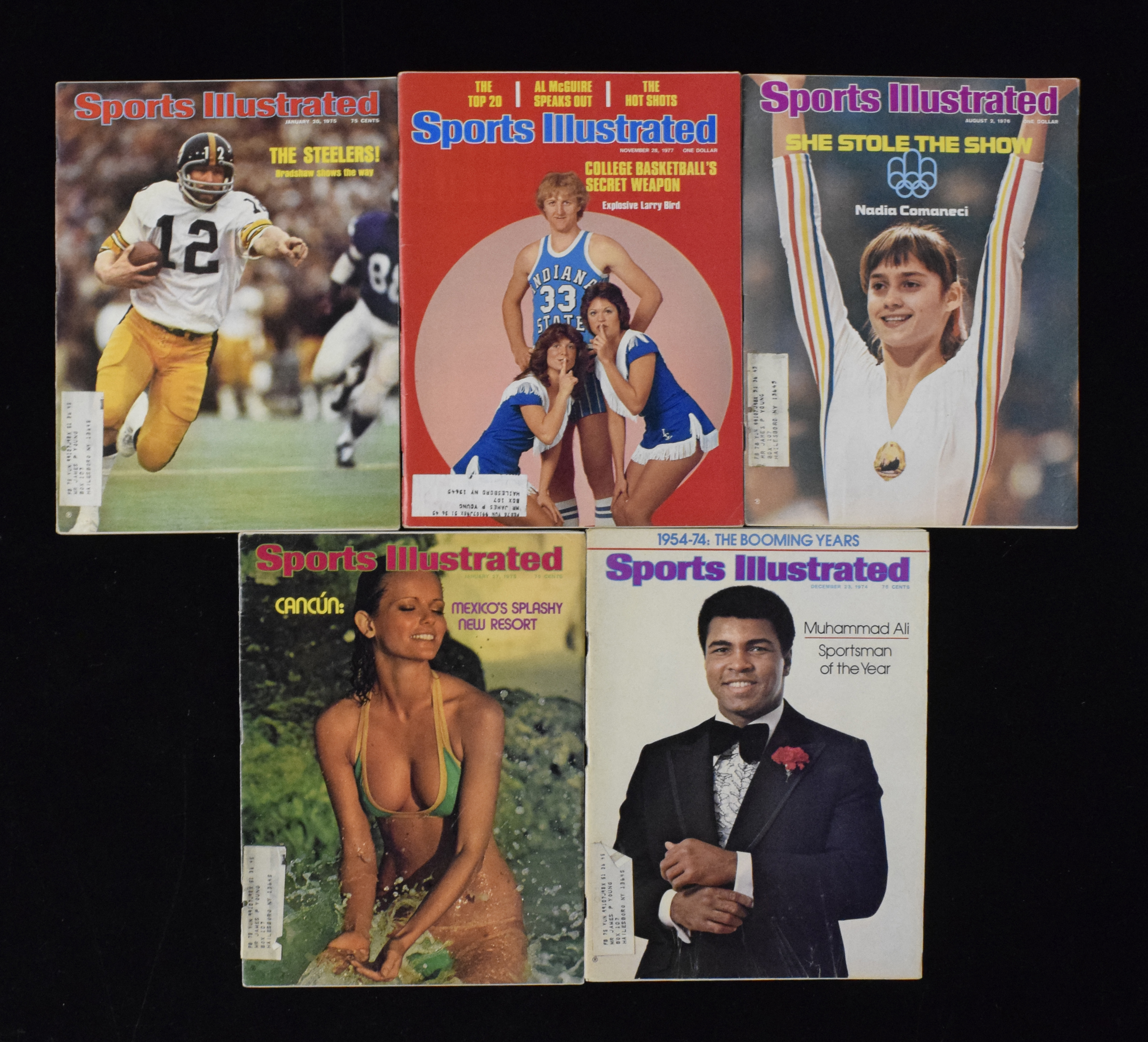 Description:Lot of (150+) 1970s Sports Illustrated magazines, including Larry Bird first cover (GD-EX/MT). Most issues span from the mid to late 1970s with mailing labels affixed. Highlights include Nov. 28, 1977 Larry Bird first cover, along with covers on Pete Rose, Ted Williams, Kareem Abdul-Jabbar, George Brett, Muhammad Ali, Nadia Comaneci, Bill Walton, Reggie Jackson, Terry Bradshaw, several swimsuit issues and many more. Most appear VG/EX-EX with some better and some worse. Range: GD-EX/MT (mailing labels affixed).