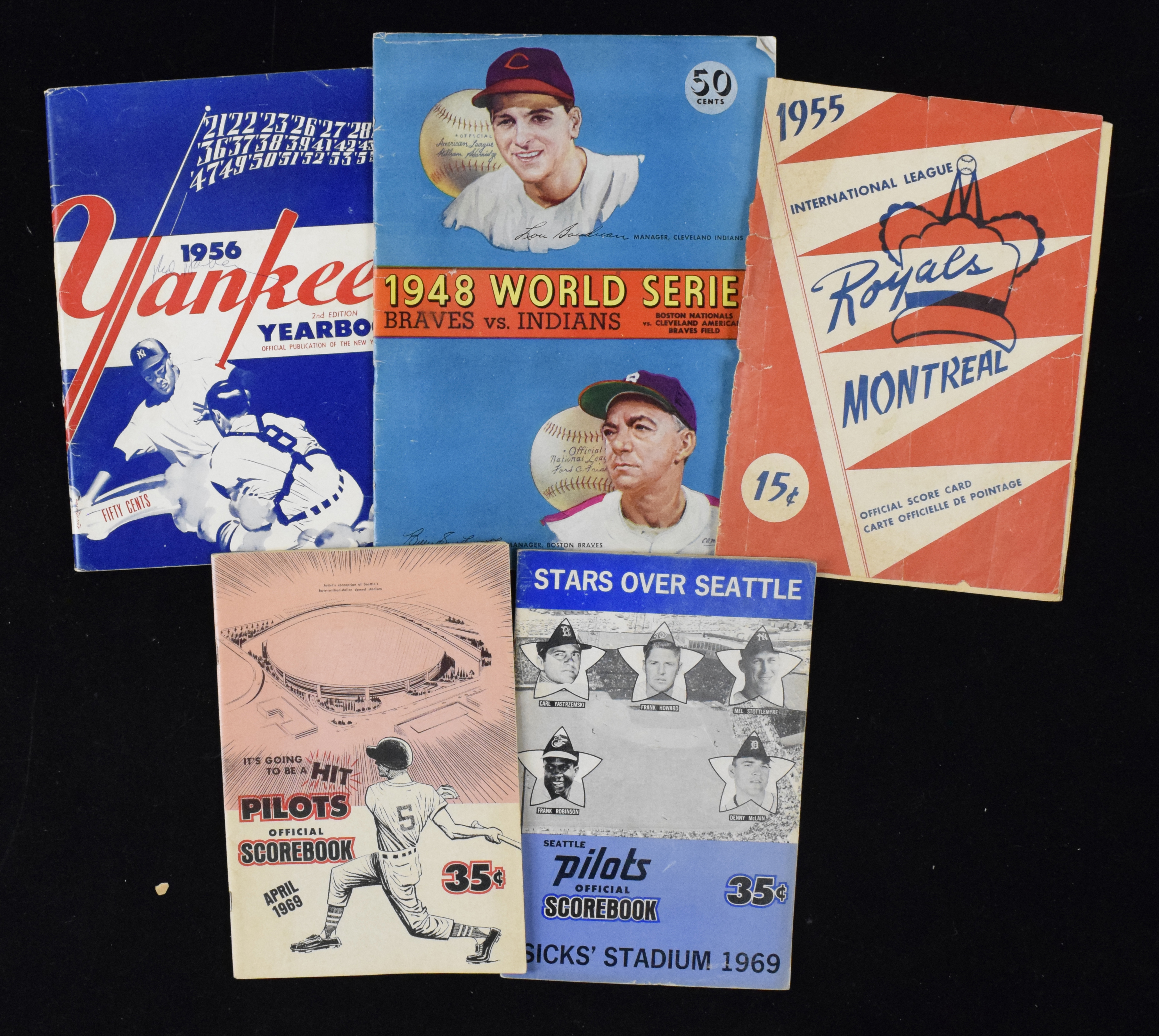 Description:Lot of (5) vintage publications with 1955 Montreal Royals yearbook & 1969 Pilots first program (PR-VG/EX). Assortment of vintage publications includes (1) 1948 World Series program (Braves field; unscored with heavy scrapbook removal damage/residue on back cover; PR); (1) 1955 Montreal Royals scorecard (Drysdale and Lasorda on roster; scored; PR, covers separated); (1) 1956 N.Y. Yankees yearbook (GD; writing on cover); (1) April 1969 Seattle Pilots first program/scorecard (unscored; VG/EX) and (1) Seattle Pilots blue cover program/scorecard (unscored; VG). Range: PR-VG/EX.