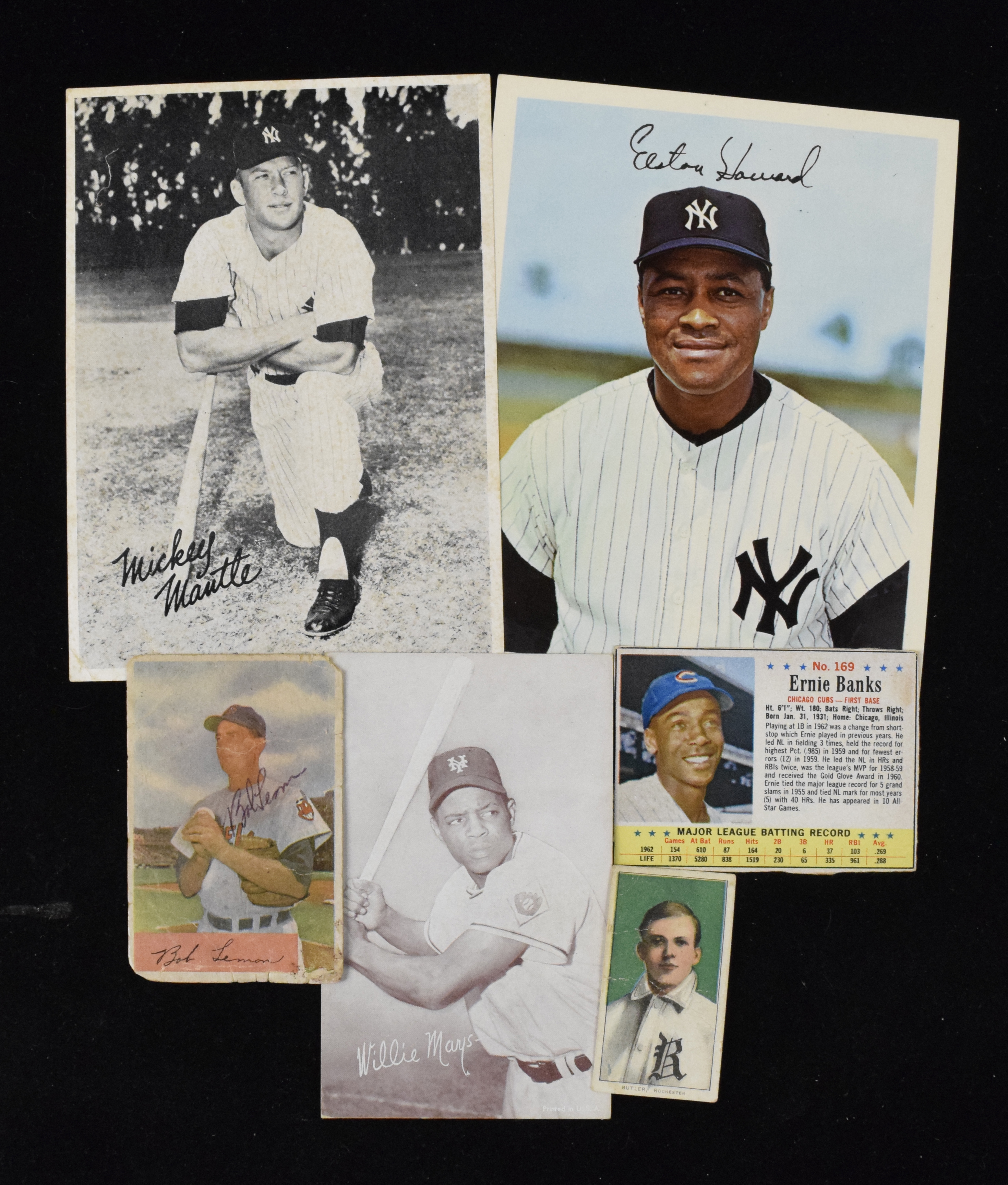 Description:Lot of (14) 1909-1967 cards and photos, including T206, Mickey Mantle picture pack (PR-EX OC). Generally low-grade lot includes (1) 1909-11 T206 John Butler (PR; writing on reverse) (1) 1947-66 Exhibits Willie Mays (PR; ink mark on reverse); (1) c. 1960s Mickey Mantle 5"x7" picture pack photo with facsimile signature (PR; tape residue on reverse); (1) 1954 Bowman #196 Bob Lemon autographed card (Sig. NM; Card: Very PR); (3) 1962 Post cards: #s 114 Duke Snider, 122 Frank Robinson, 20 Al Kaline and (1) 1963 Post: #169 Ernie Banks (VG-VG/EX hand-cut); (1) 1961 Topps #126 Dick Stuart (EX OC) and (5) 1967 Dexter Press Yankees: Elston Howard, Jim Bouton, Fritz Peterson, Horace Clarke and Steve Hamilton (PR; staple holes). Range: PR-EX OC.