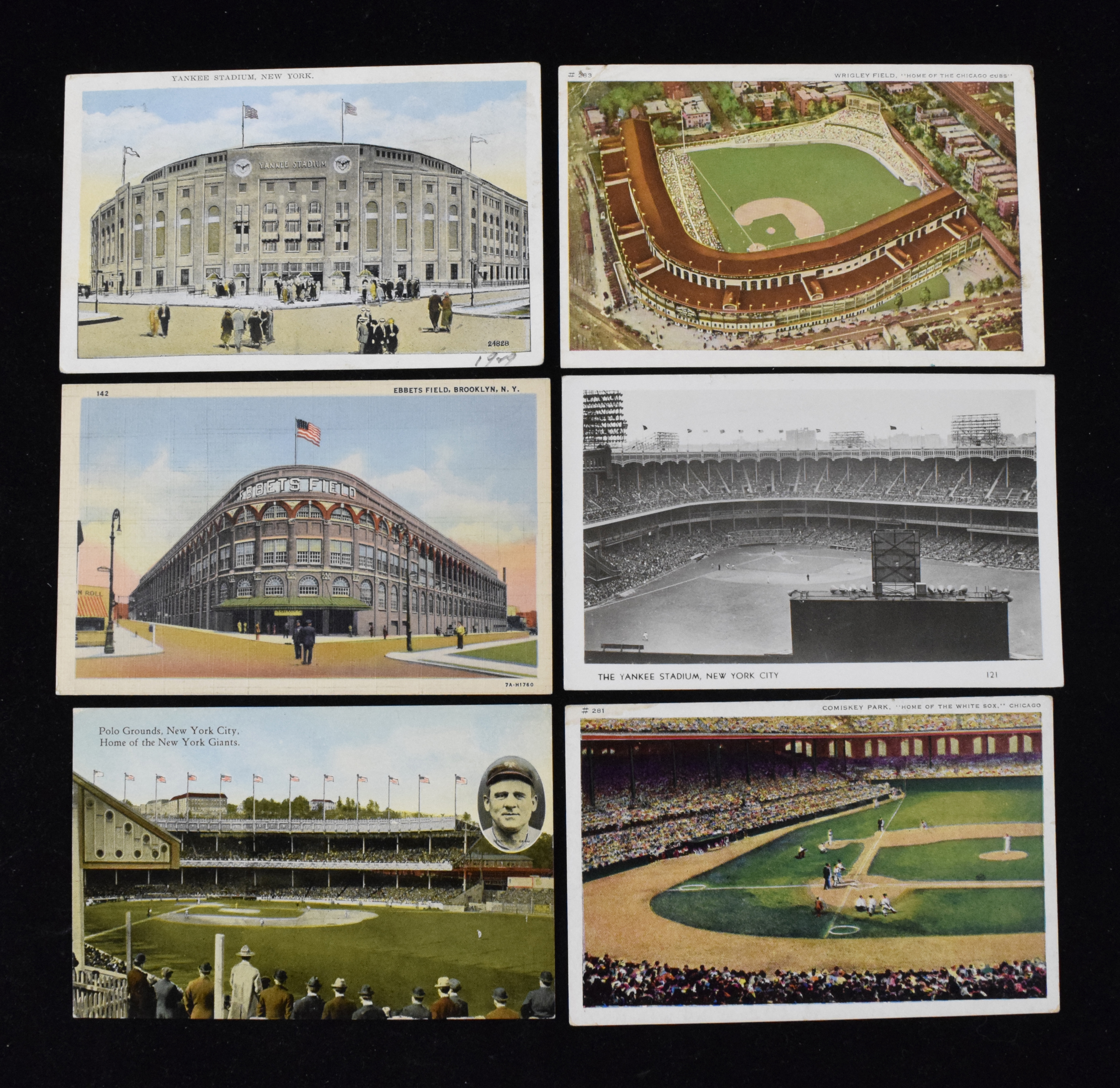 Description:Binder of (132) baseball stadium postcards, c. 1920s-2000s (GD-NM). Lot of baseball stadium postcards, housed in pages and an attractive binder, cover a number of Major League venues and a few Minor League. Includes Fenway Park, many Yankee Stadium, Polo Grounds, Briggs Stadium, Wrigley Field, Municipal Stadium, Forbes Field, Crosley Field, White Sox Park, Three Rivers Stadium, Braves Field, Comiskey Park, Sportsmen's Park, Riverfront Stadium, Milwaukee County Stadium, Memorial Stadium, Veterans Stadium, Ebbetts Field, Connie Mack Stadium and many more. Also includes (2) softcover books: "Baseball Stadium Postcards" checklist and price guide by Tom Crabtree. Varying degrees of wear throughout with some pieces postally cancelled: PR-NM