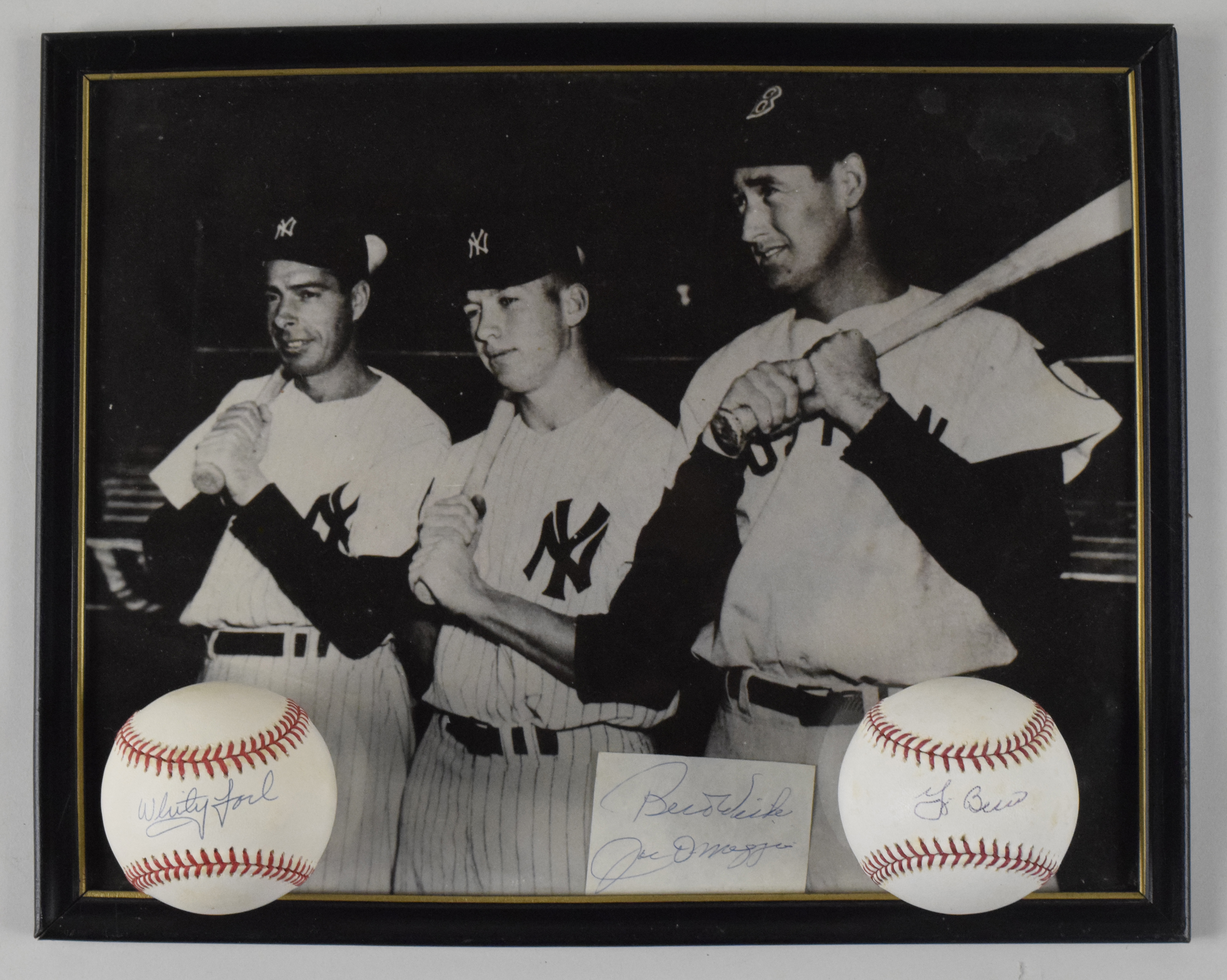 Description:Lot of (3) N.Y. Yankees HOFer-autographed items, with DiMaggio, Ford and Berra (Sigs. NM-NM/MT). Nice assortment of Yankees autographed items, each signed by a Hall of Famer. Includes (1) G. Budig A.L. baseball signed by Whitey Ford; (1) B. Selig MLB baseball signed by Yogi Berra and (1) 12"x15" framed photo of Joe DiMaggio, Mickey Mantle and Ted Williams, with insert cut signature of Joe DiMaggio. Signatures rate 7/8 out of 10, and items range EX/MT-NM.