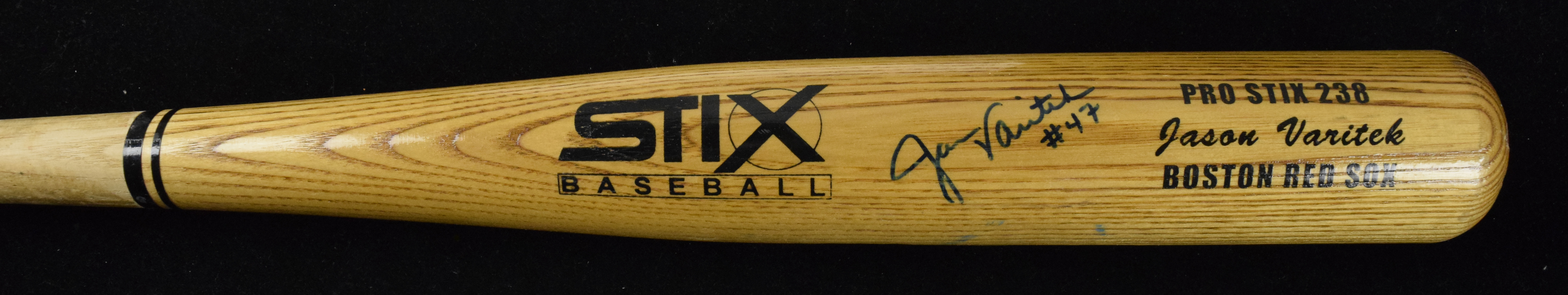 Description:Jason Varitek autographed professional model baseball bat, c. 1997-98 (VG/EX). Stix Pro Stix 238 model bat with Varitek name and Boston Red Sox printed on the barrel measures 34" long and weighs 30.1 oz. Varitek's early-career #47 is written in marker on the knob and barrel end, dating the bat to prior to 1999, when Varitek switched to #33. Varitek signed the barrel in blue marker with "#47" inscription, rating 8 out of 10, There is outstanding use is evident throughout, with ball contact marks, pine tar residue on the handle and a substantial handle crack that is held together with black tape: VG/EX.