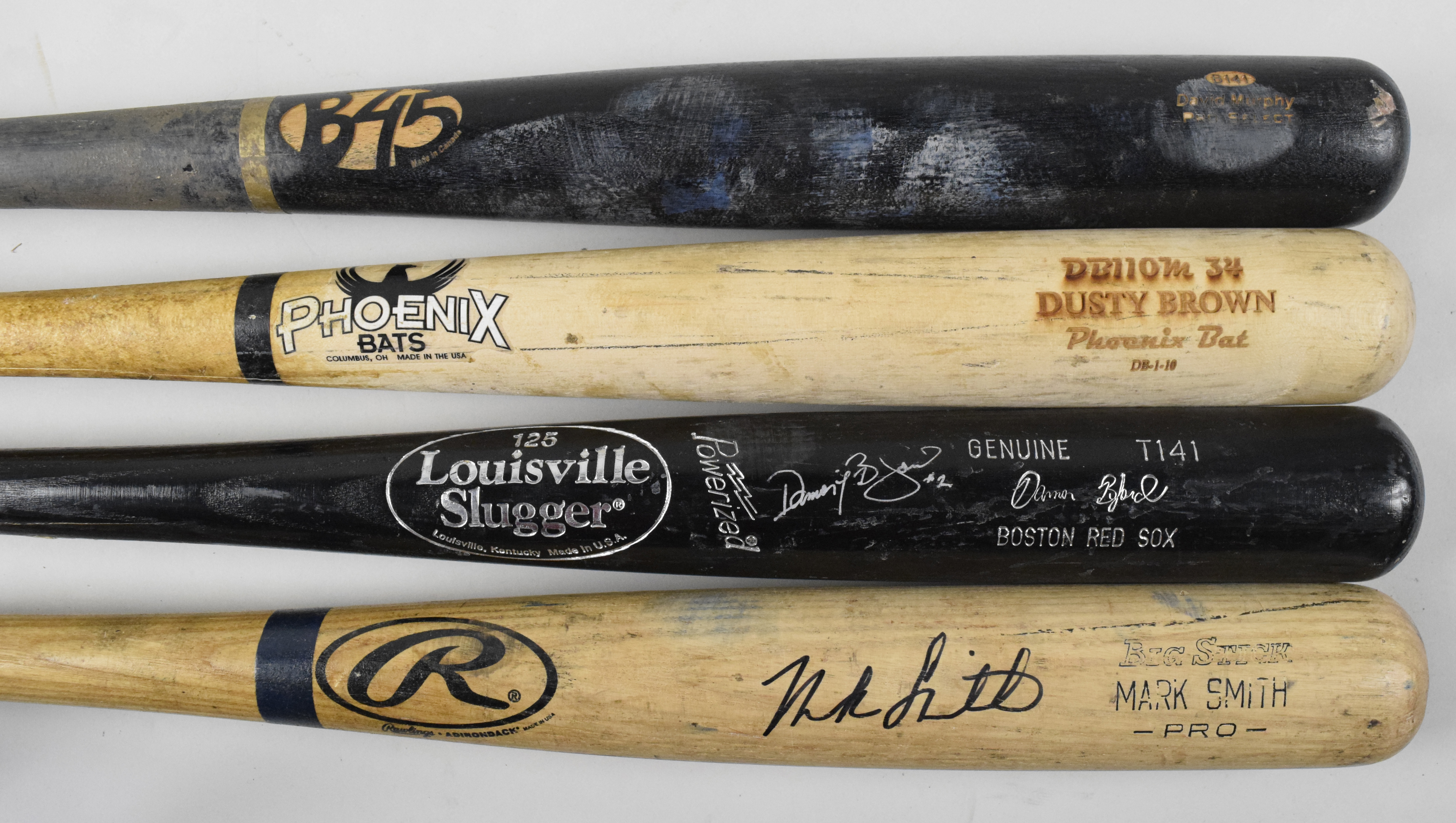 Description:Lot of (10) professional model baseball bats, with some autographed (FR-VG/EX). All have evidence of heavy use, including pine tar, ball contact marks and most cracked (some held together with tape). Includes (1) 34" Louisville Slugger R205 Angel Chavez (cracked); (1) 34" Phoenix Bats DB110M 34 Dusty Brown (cracked; "Brown" on knob); (1) 33" Louisville Slugger T141 Damon Buford (cracked; autographed); (1) 34" Louisville Slugger 113 Michael Coleman (cracked; autographed); (1) 34" Rawlings Adirondack Big Stick Mark Smith (uncracked; autographed; "29" on knob); (1) 34" B45 B141 David Murphy (uncracked); (1) 34" Mizuno Pro Mike Lansing (uncracked; autographed); (1) 33" Louisville Slugger C243 Wilton Guerrero (cracked; autographed with "To Papi" inscription; "6" on knob and barrel end); (1) 34" Louisville Slugger C243 Wilton Veras (cracked; autographed); and (1) 34" Rawlings Adirondack Kelly Shoppach (cracked). Signatures range from 6 to 8 out of 10, and bats range FR-VG/EX (most cracked).