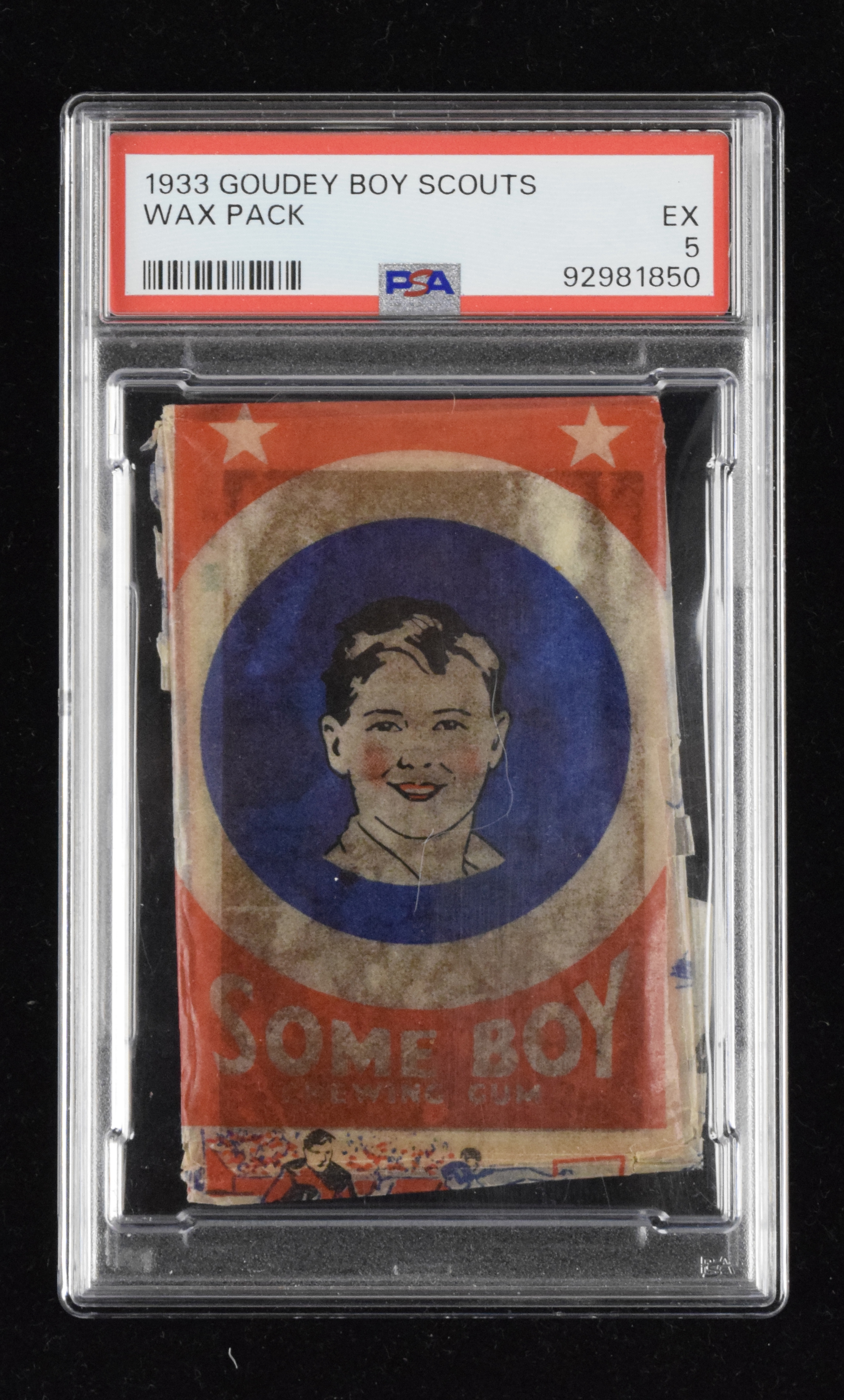 Description:Rare 1933 R26 Goudey Boy Scouts unopened wax pack (PSA 5 EX). Outstanding original "Some Boy" unopened wax pack features cards of boys engaged in scouting activities such as canoeing, archery, and map-making, issued in the same year as Goudey's legendary baseball card set. Pack remains tightly sealed with some wear to the edges, and has been authenticated and encapsulated by PSA: PSA 5 EX. ($500-$1,000)