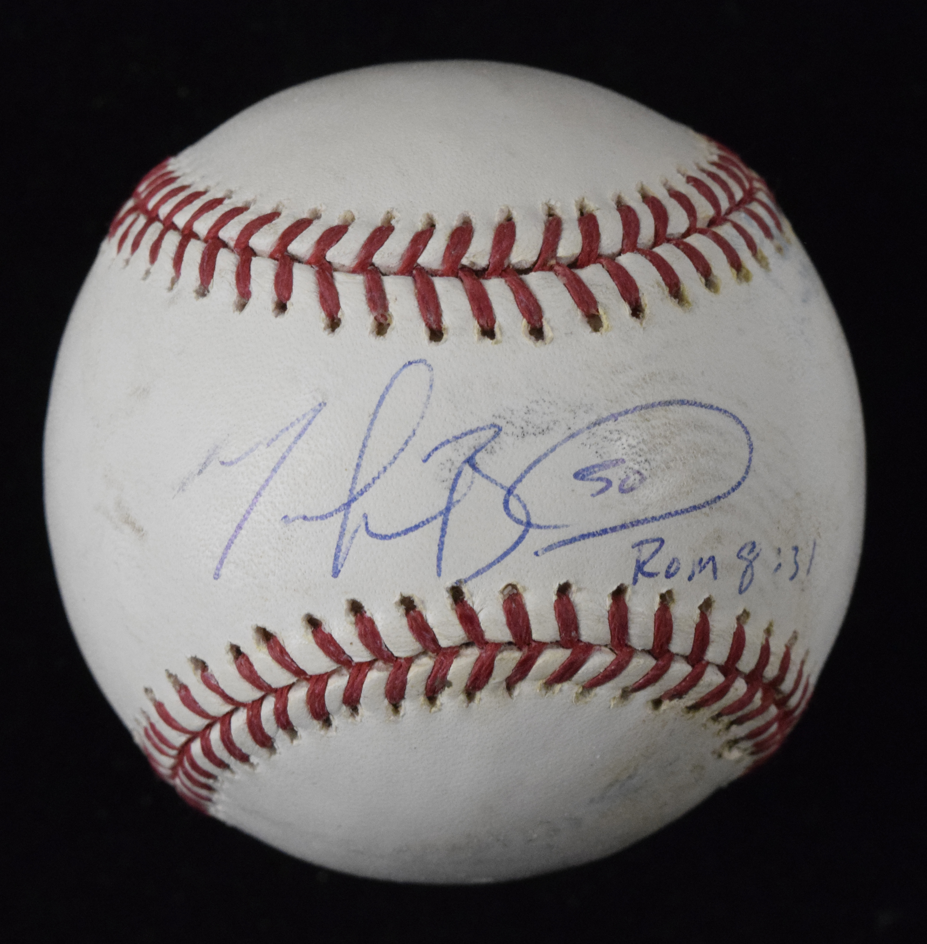 Description:Mookie Betts autographed R. Manfred baseball (Sig. NM). R. Manfred MLB baseball has been signed on the sweet spot by Mookie Betts with "50" and "Rom 8:31" inscriptions, rating 7 out of 10. Baseball has some wear: EX.