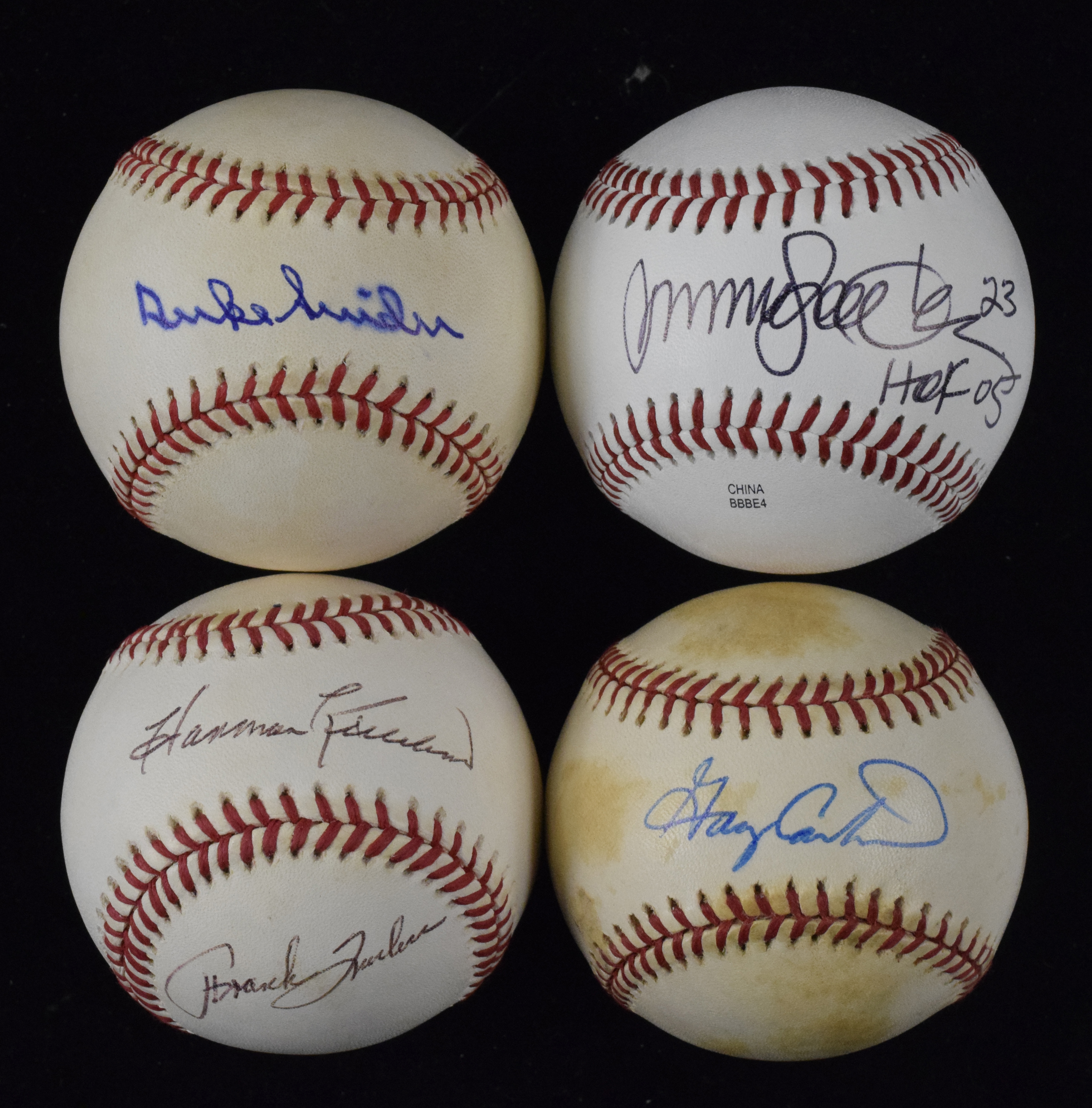 Description:Lot of (4) HOFer autographed baseballs, with Sandberg, Killebrew and Snider (Sigs. NM/MT-MT). Assortment of Hall of Famer-signed baseballs includes (2) on L. Coleman N.L. balls: Duke Snider and Gary Carter; (1) B. Brown A.L. baseball signed by Harmon Killebrew with Frank Lucchesi on a side panel; and (1) International League ball signed by Ryne Sandberg with "23" and "HOF 05" inscriptions. Signatures rate 8/9 out of 10, and balls have light to heavy toning: VG-NM/MT.