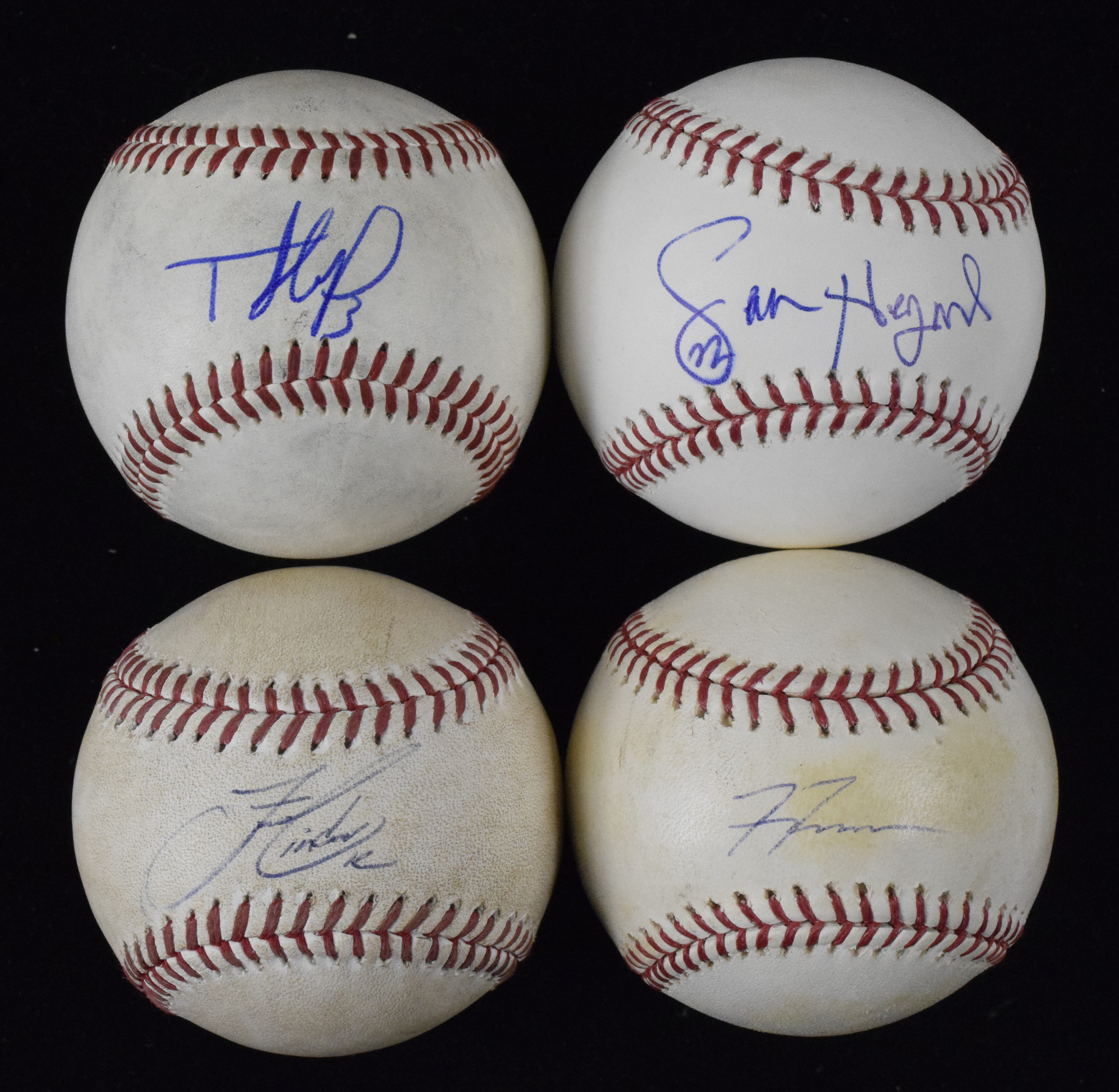 Description:Lot of (4) MLB player autographed baseballs, with Lindor, Freeman and Hernandez (Sigs. NM-NM/MT). Lot includes (2) signed on B. Selig MLB baseballs: Freddie Freeman and Jason Heyward; (1) on a R. Manfred MLB ball: Francisco Lindor and (1) on an International League ball: Teoscar Hernandez. Signatures rate 7/8 out of 10 and balls have light to heavy wear: VG-NM/MT.
