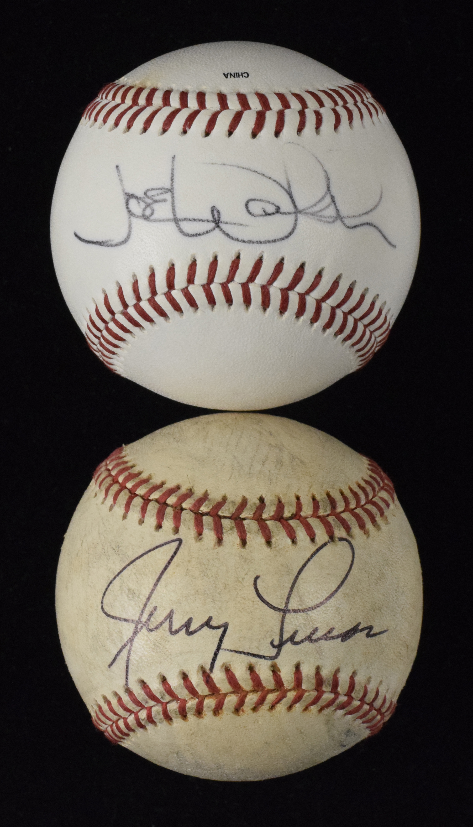 Description:Pair of non-baseball player signed baseballs, with Joe Walsh and Jerry Lucas (Sigs. NM-NM/MT). Interesting pair of single-signed baseballs, with (1) N.Y. Penn League ball signed by Eagles band member Joe Walsh and (1) G. Budig A.L. ball signed by NBA Hall of Famer Jerry Lucas. Signatures rate 7/8 out of 10, and balls have light to heavy toning/wear: VG-NM/MT.